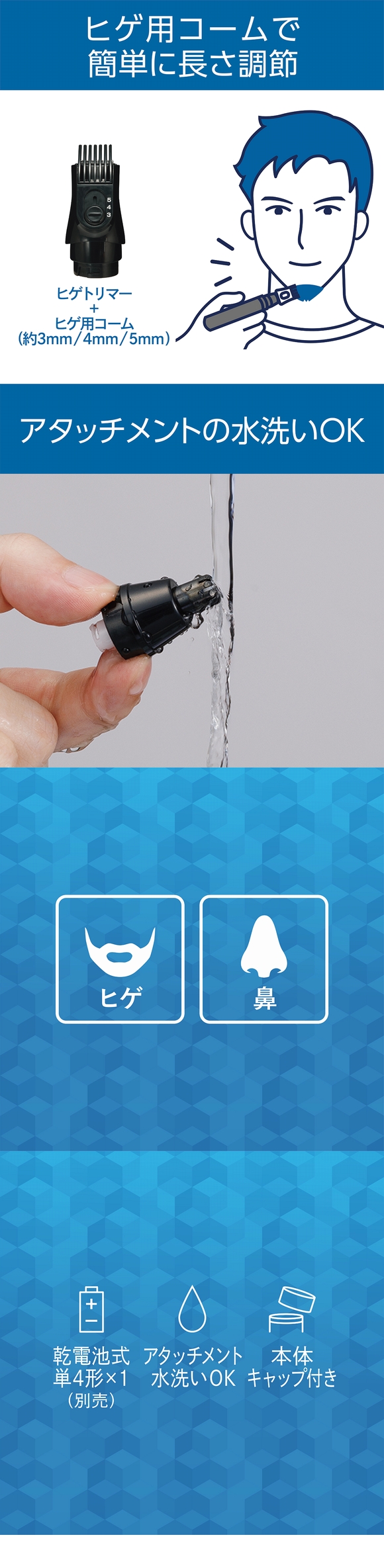 | 商品特徴 | ●アタッチメントが水洗いOKでいつも清潔に ●ヒゲトリマーには3段階の長さ調節コームアタッチメント付き(約3・4・5mm) ●奥から生えてる長い鼻毛に適した「回転式鼻毛カッター」 ●手前の短い鼻毛に適した「往復刃式鼻毛カッター」 ●スマートに持ち運べるキャップ一体型デザイン | ||