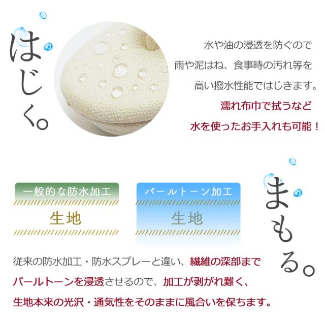膜をはる防水加工や防水スプレーと違い、繊維の1本1本の深部までパールトーンを浸透させるので、加工が剥がれにくく、高い撥水効果で水をはじきます。