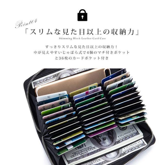スキミング防止機能付き、ファスナー開閉、カード36枚収納