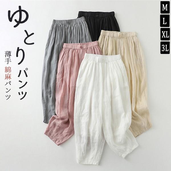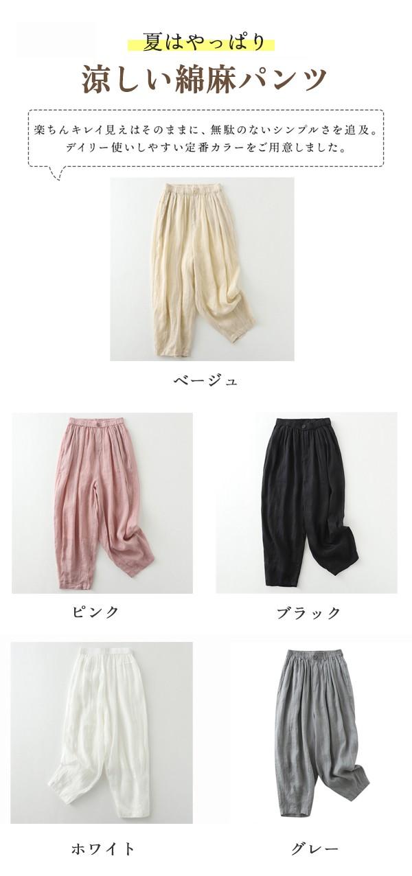 【レビュー投稿で+5%還元】綿麻パンツ 麻 リネン イージーパンツ レディース コットンリネン ウェストゴム 体型カバー サルエルパンツ 無地 大きいサイズ 春 夏 涼しい ゆったり リラックス 部屋着 シンプル ルームウェア 薄手 通気 吸湿 快適 カジュアル