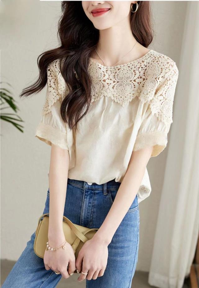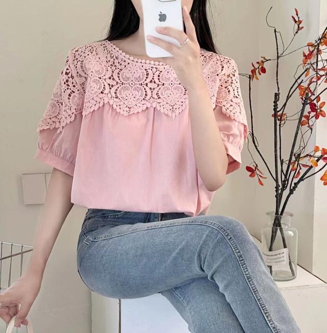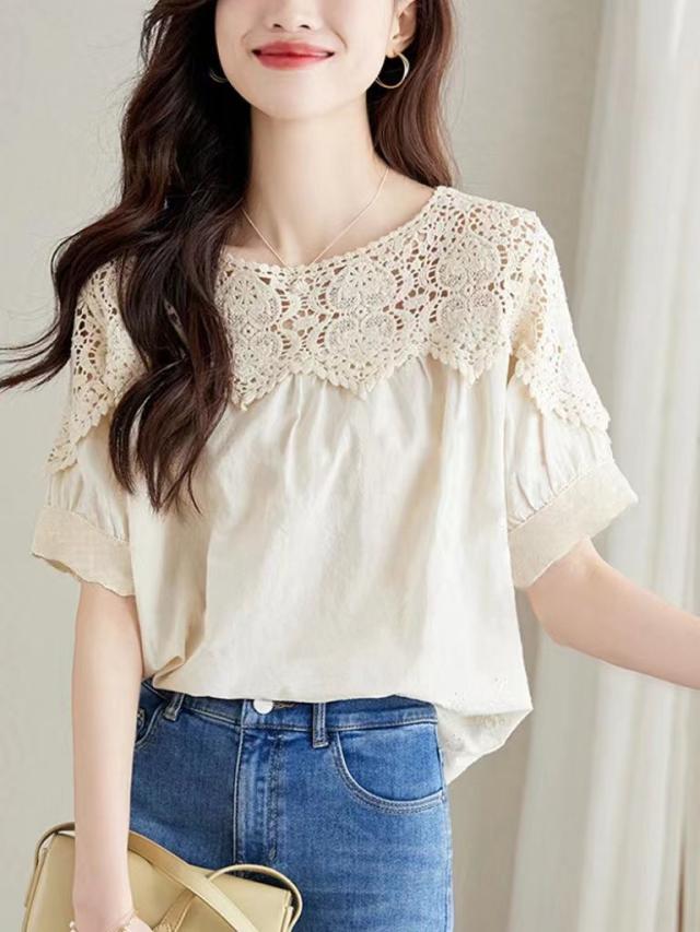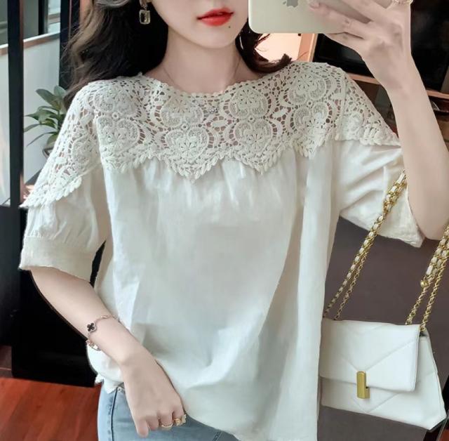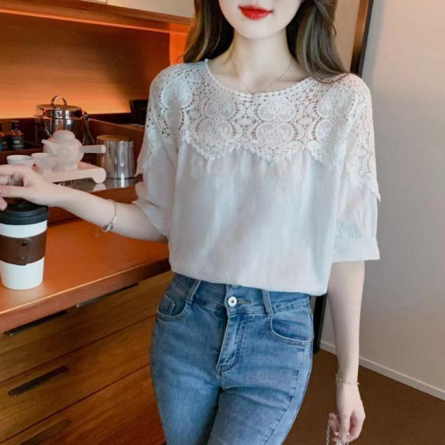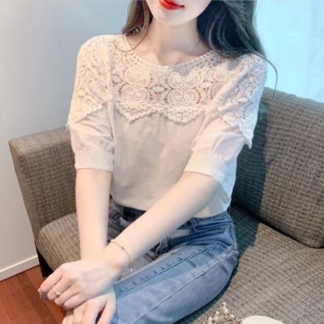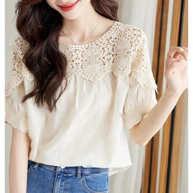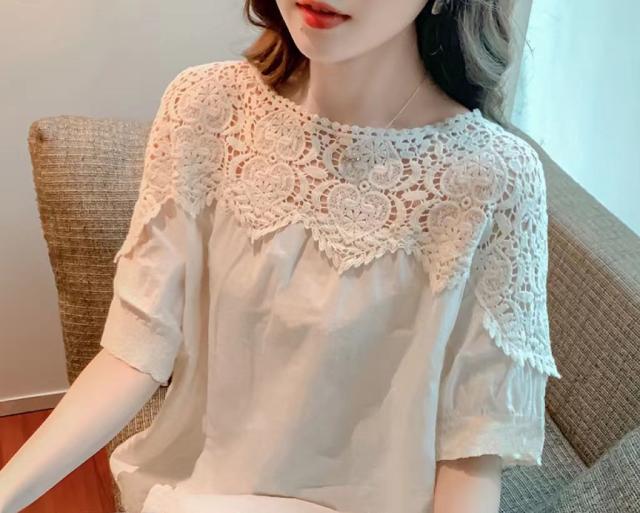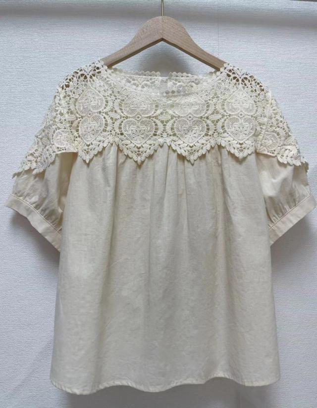 送料無料 レディース刺繍 カットソー Tシャツ 綿 透かし編み 春夏 チュニック ブラウス トップス ロングTシャツ ゆったり レース 無地 透け感 切り替え カジュアル