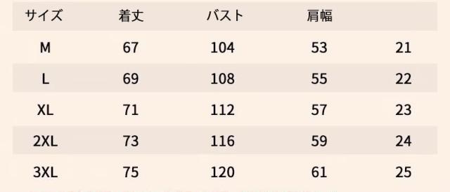 | サイズについての説明 | サイズ(cm) M 着丈67/バスト104/肩幅53 L 着丈69/バスト108/肩幅55 XL 着丈71/バスト112/肩幅57 2XL 着丈73/バスト116/肩幅59 3XL 着丈75/バスト120/肩幅61 ※サイズは平置き実寸になります。 サイズ表の実寸法は商品によって1-3cm程度の誤差がある場合がございます。 |