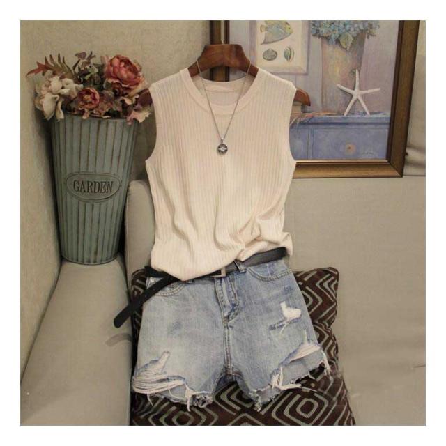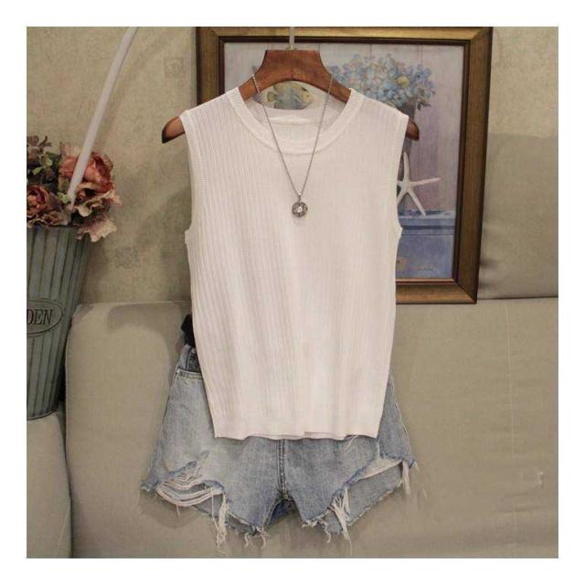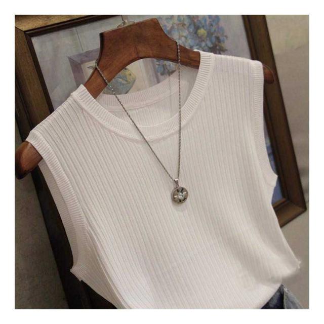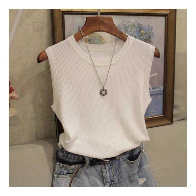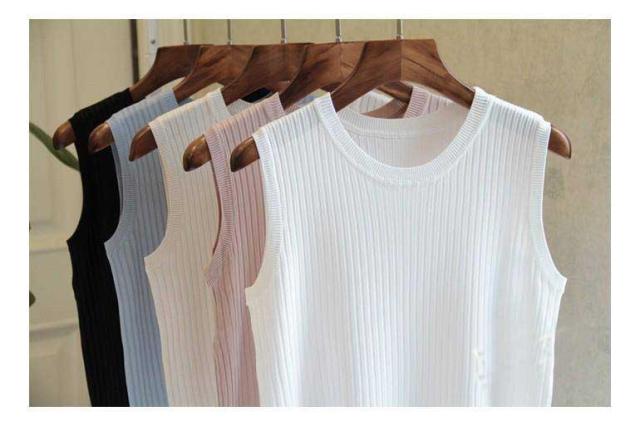 リブニット タンクトップ ノースリーブ 冷感 プチラウンドネック サマーニット 韓国ファッション 送料無料