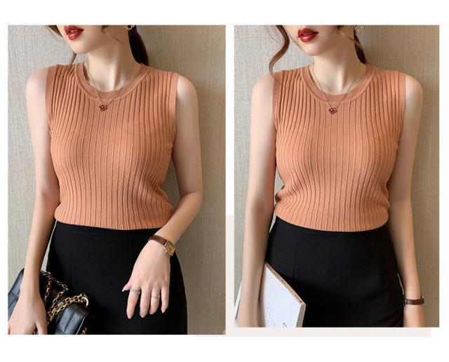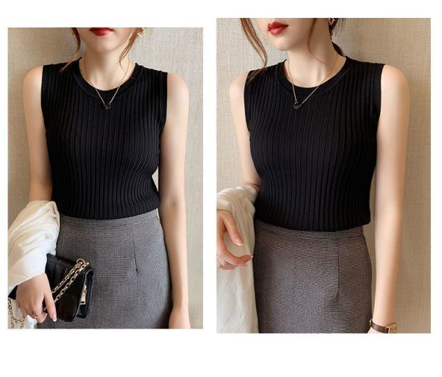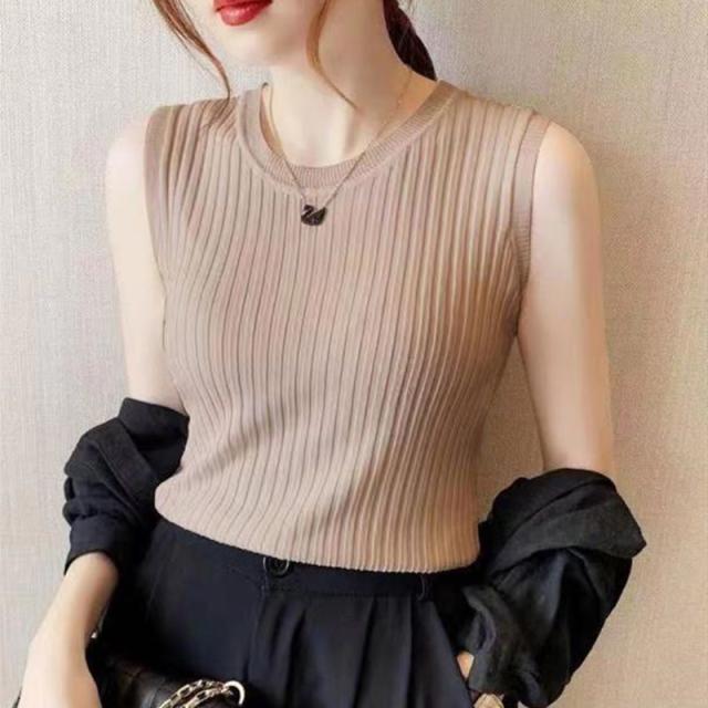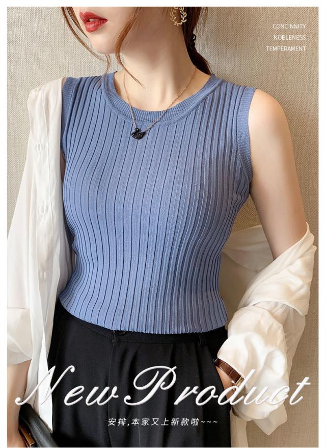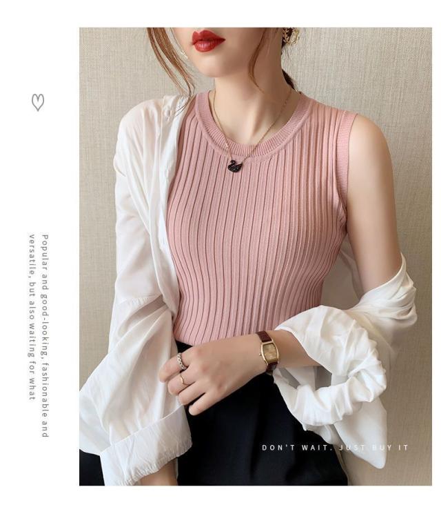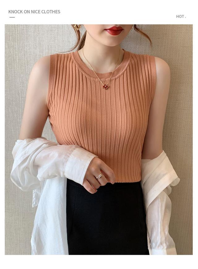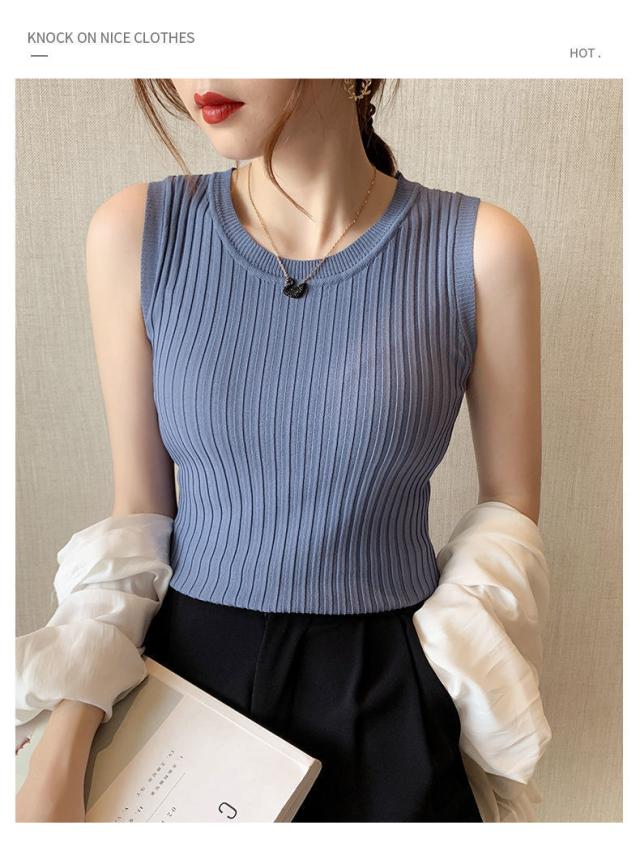 リブニット タンクトップ ノースリーブ 冷感 プチラウンドネック サマーニット 韓国ファッション 送料無料
