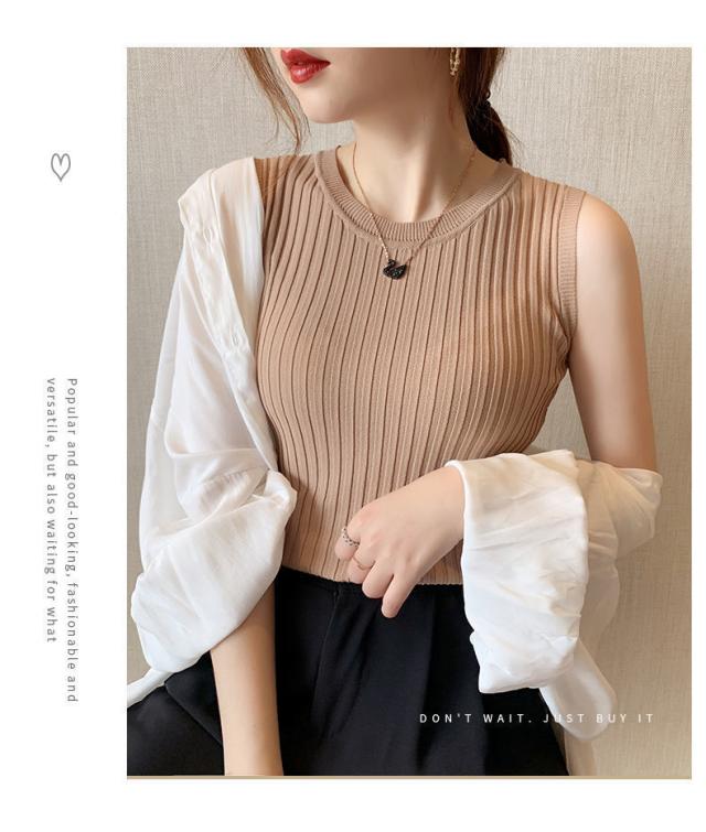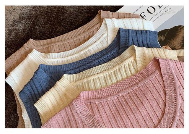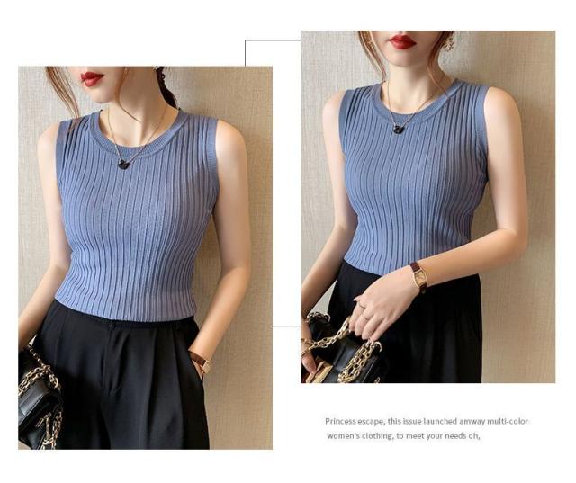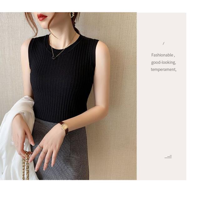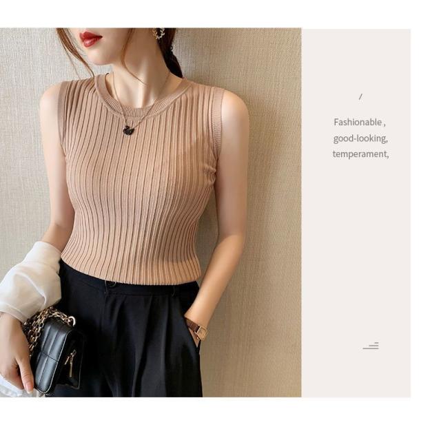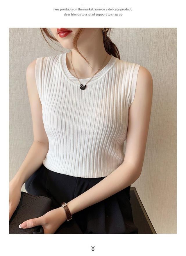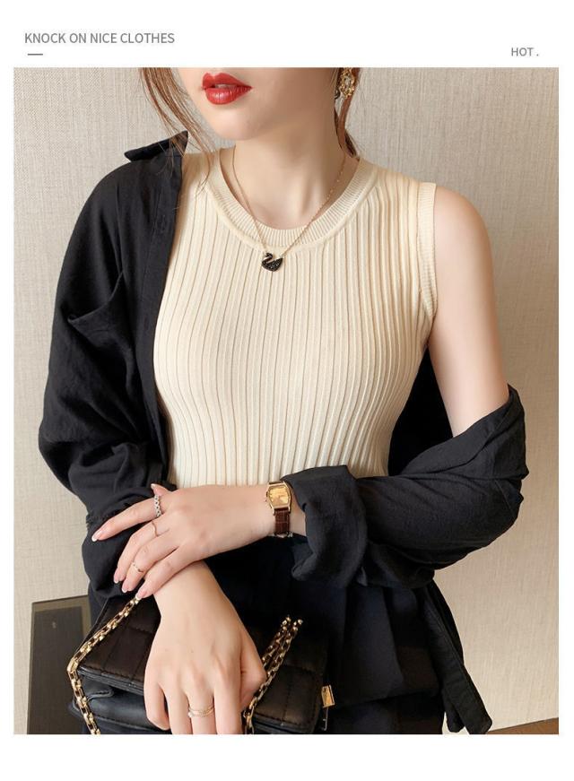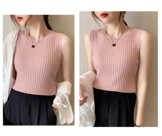 リブニット タンクトップ ノースリーブ 冷感 プチラウンドネック サマーニット 韓国ファッション 送料無料