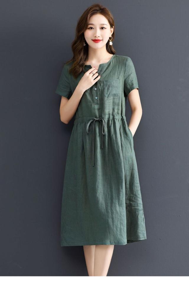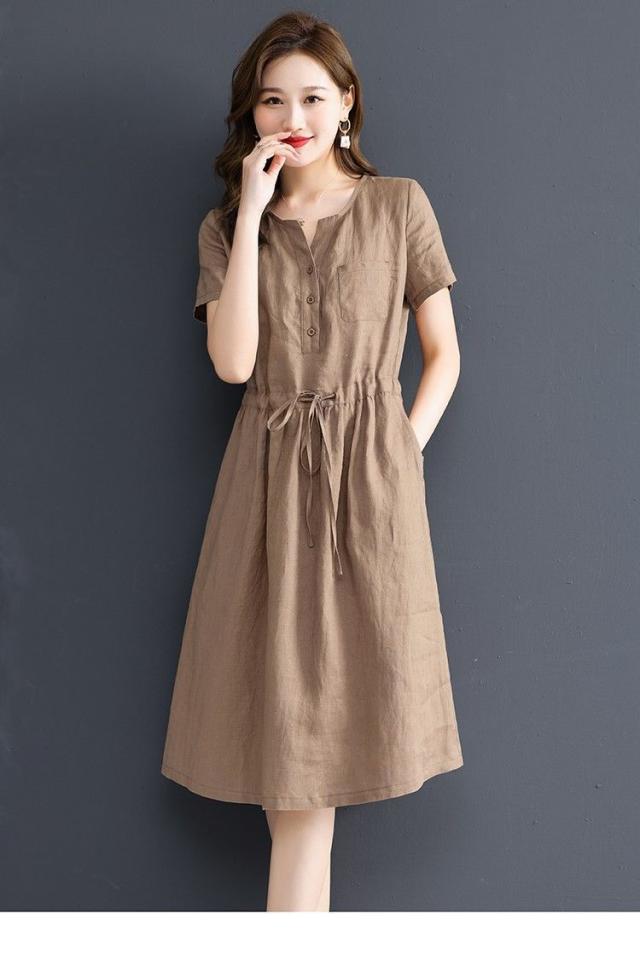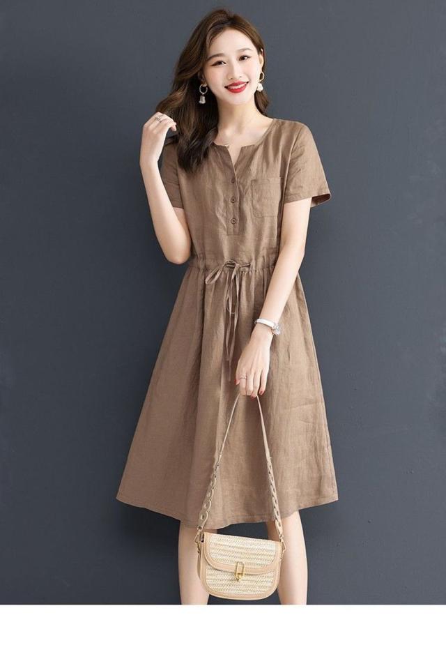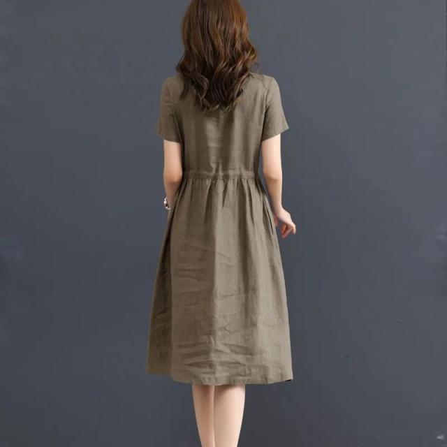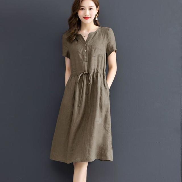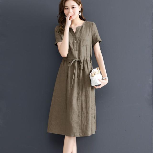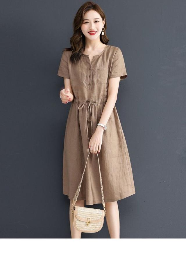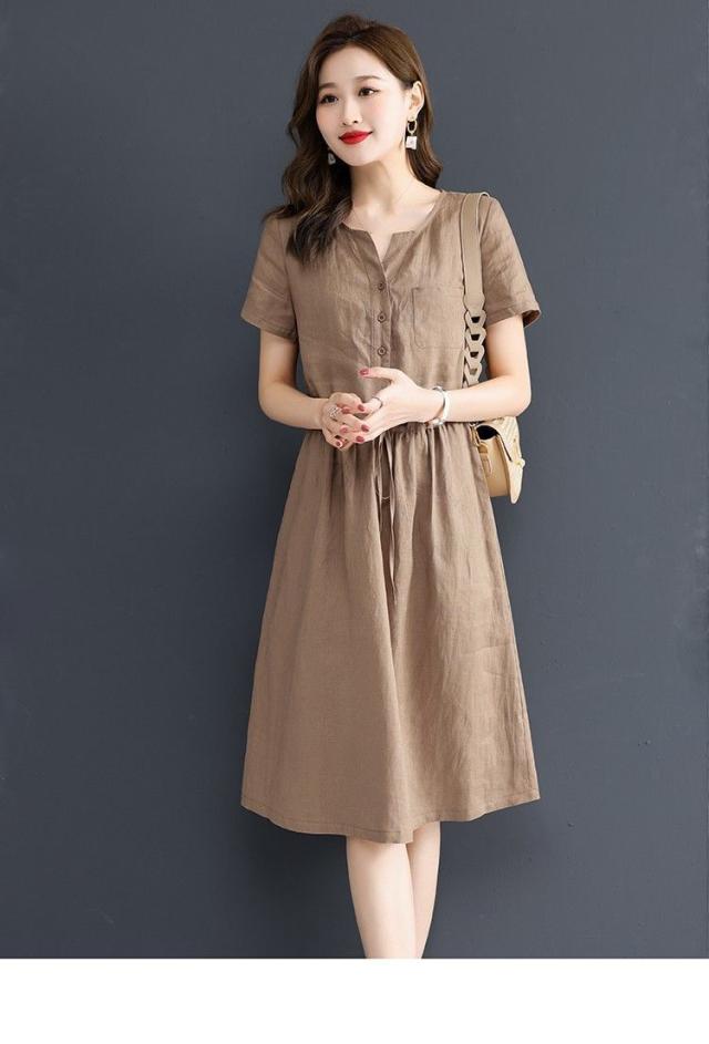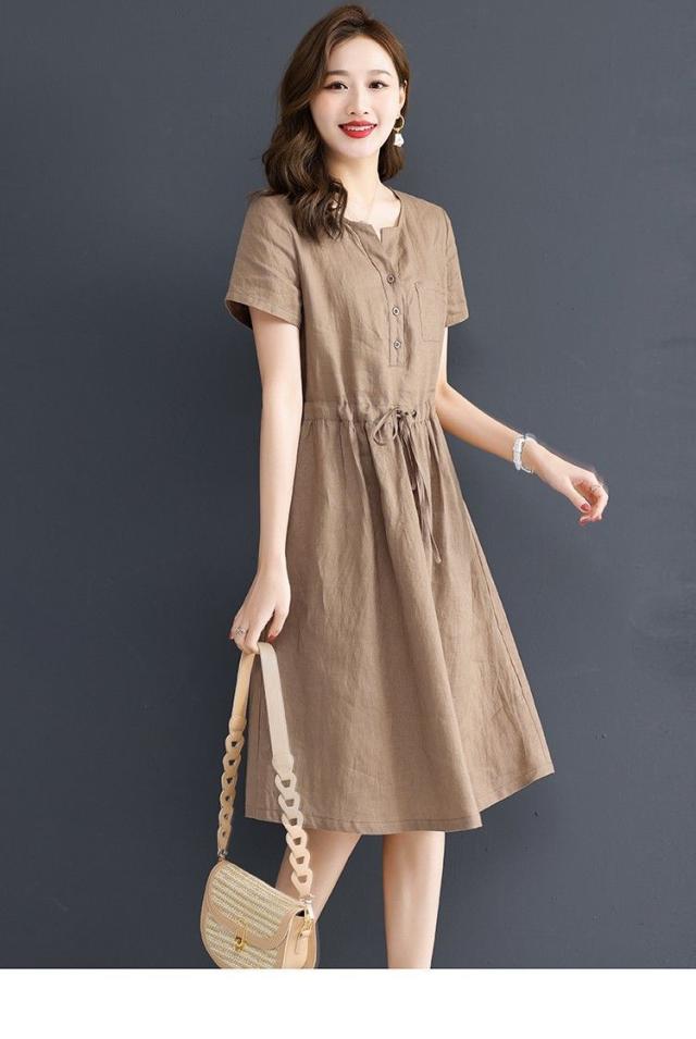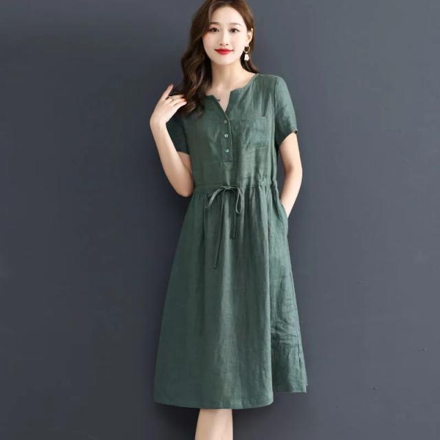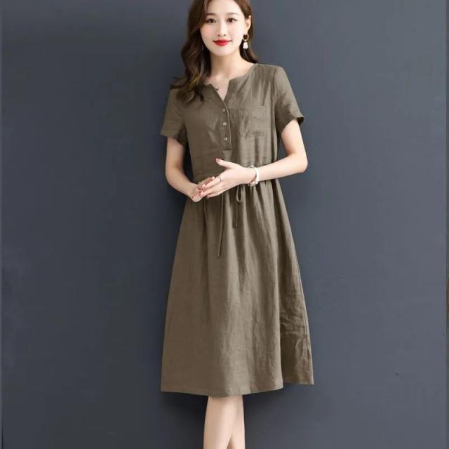 送料無料 レディースワンピース 半袖 膝丈 綿麻ワンピース お上品 Aライン 春夏 ロング丈ワンピース ゆったり 体型カバー 大きいサイズ 無地 普段着 通勤 オフィス シンプル 30代 40代 50代