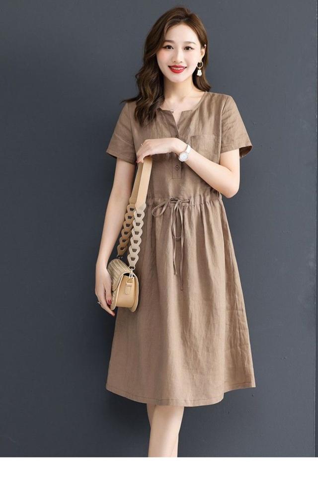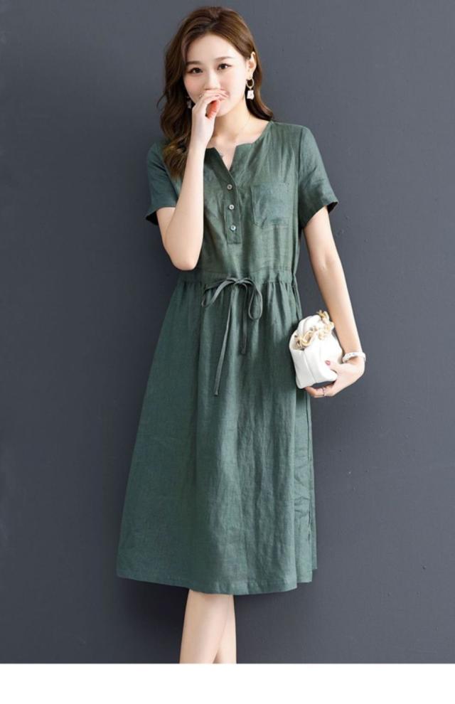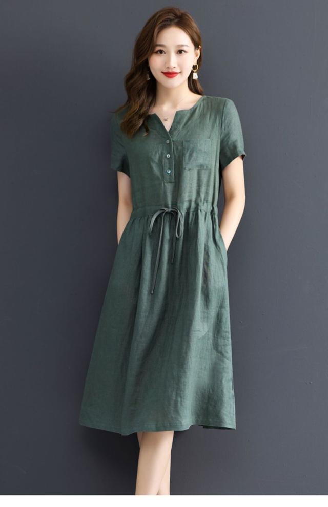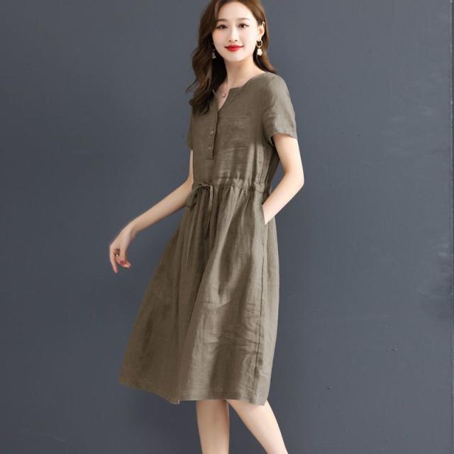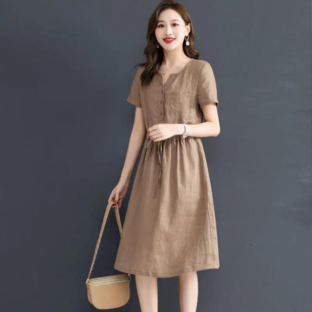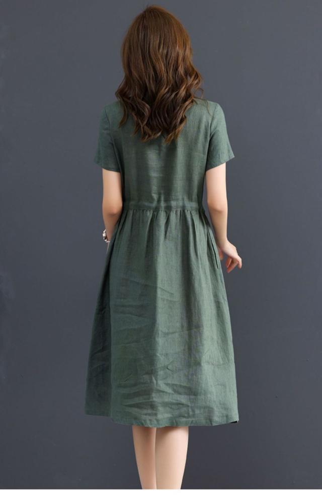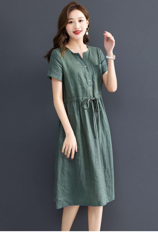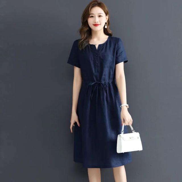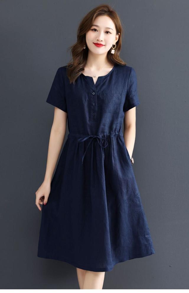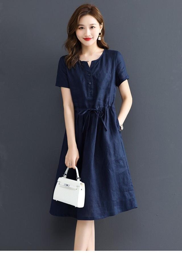 送料無料 レディースワンピース 半袖 膝丈 綿麻ワンピース お上品 Aライン 春夏 ロング丈ワンピース ゆったり 体型カバー 大きいサイズ 無地 普段着 通勤 オフィス シンプル 30代 40代 50代