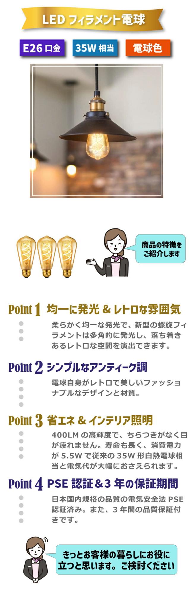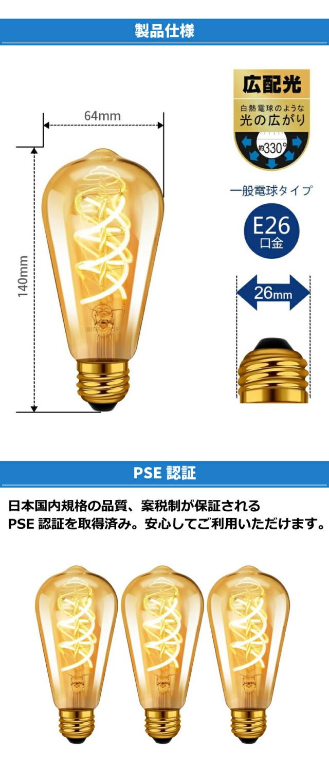 | 商品説明 | フィラメント電球 LED電球 E26口金 エジソン電球 400LM 螺旋フィラメント LEDランプ ST64 電球色 茶色 シャンデリア用 レトロ電球 均一発光 エジソンランプ 装飾電球 雰囲気 調光器非対応 3個入 |