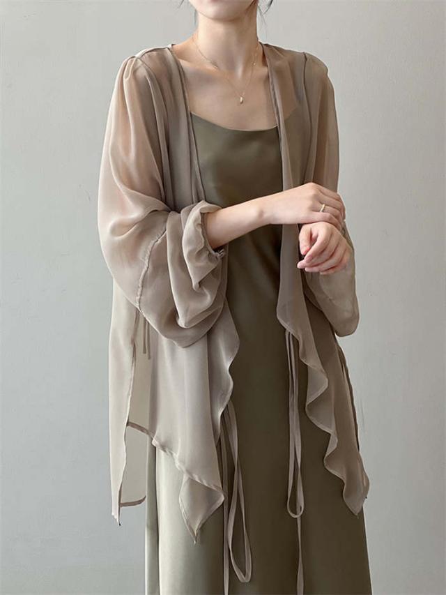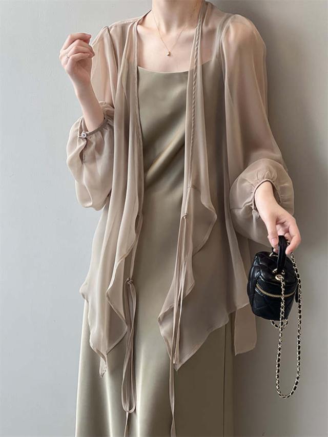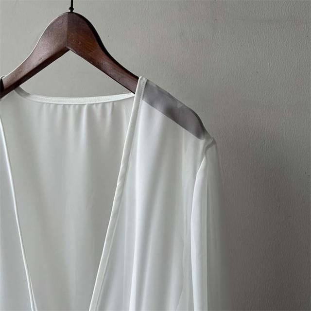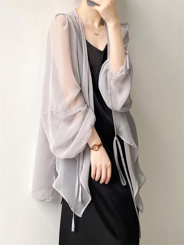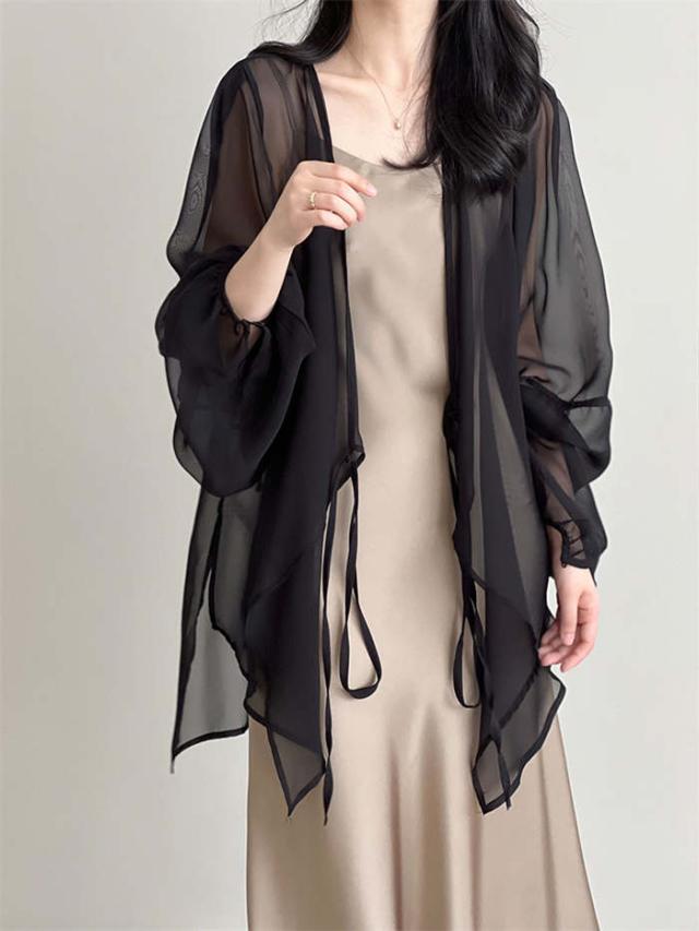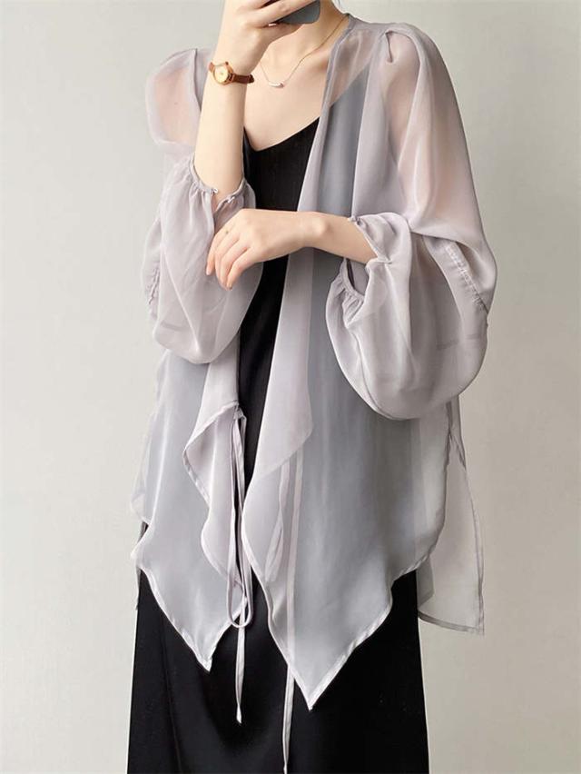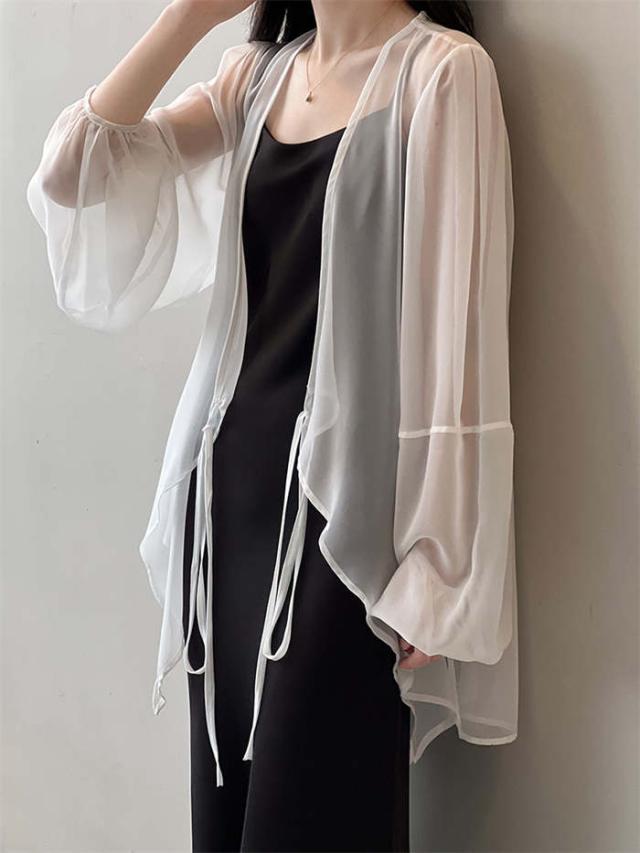 カーディガン レディース 夏 薄手 uvカット 紫外線対策 シアーシャツ 羽織 トップス 長袖 透け 透け感 チュニック丈 ゆったり アウター 体型カバー 冷房対策 エレガント フェミニン きれいめ おしゃれ 20代 30代 40代 50代 ホワイト ベージュ ブラック グレー M L