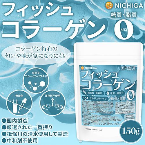 フィッシュコラーゲン(国内製造) 150g 【メール便専用品】【送料無料】 厳選一番搾り 低分子コラーゲン 糖質0・脂質0 無香料・無着色 [04] NICHIGA(ニチガ) 中和剤不使用