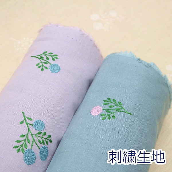 かわいいお花の刺しゅうが入った綿麻シーチング生地。