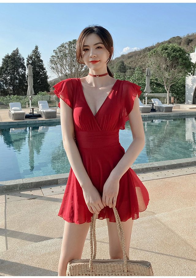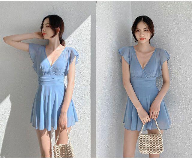 ワンピース 水着 シースルー Vネック パッド入り ワイヤーあり ビーチ スイムドレス シアー ウエストマーク フリル スカート レディース