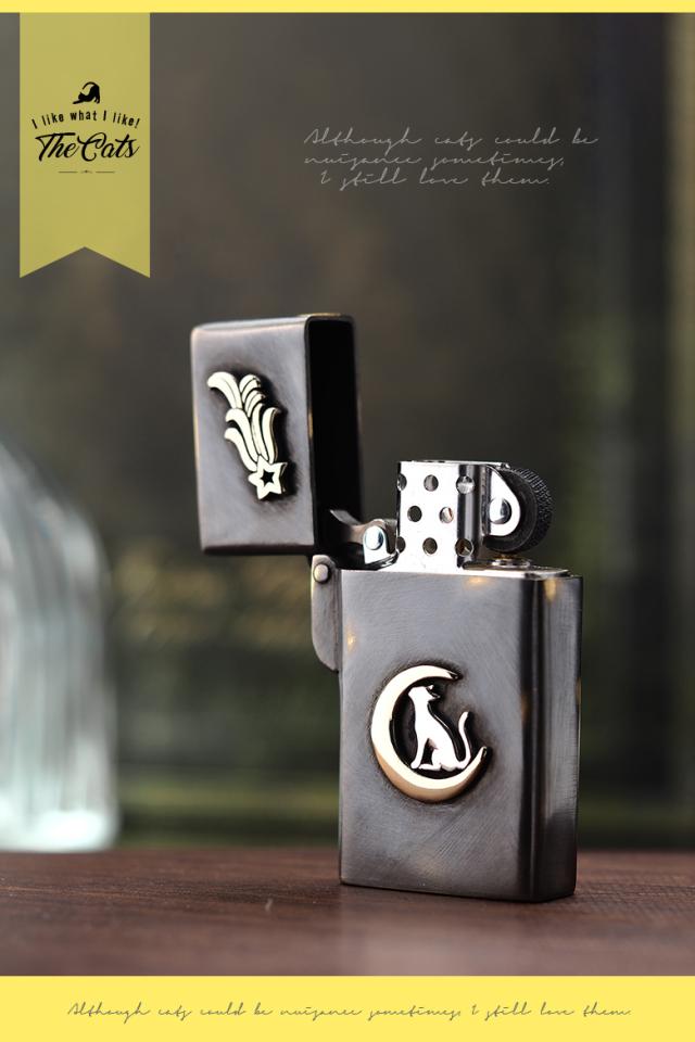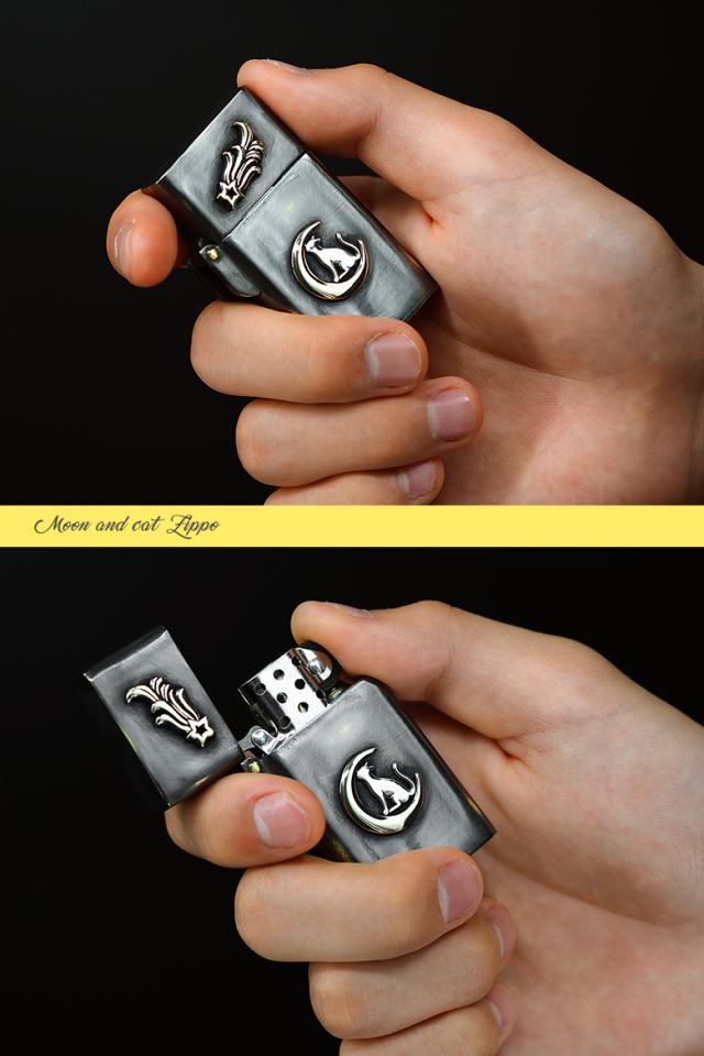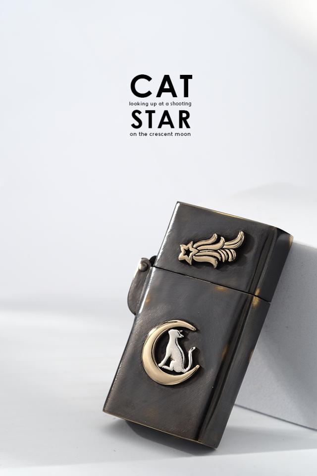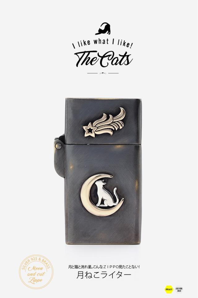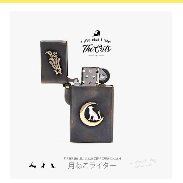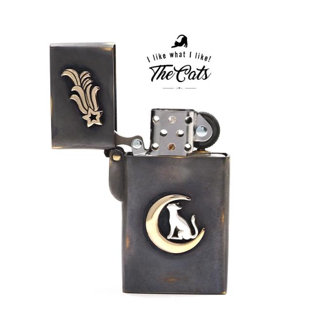 猫をモチーフにしたZippoライターです。三日月の上に乗ったネコが見上げる先に流れ星が流れているというストーリー性を感じる作品。黒く燻された表面の一部にわざと擦り傷をいれ、アンティーク調に仕上げています。通常のZIPPOの幅よりも細いスリムタイプで、握りやすく取り扱いやすいのも特徴です。素材は、真鍮をベースに作られており、ネコの部分はシルバー925で制作されています。猫好きに使ってもらいたいライターです※Zippoのインサイドユニットには小傷がありますが、新品未使用のものを使用しています。