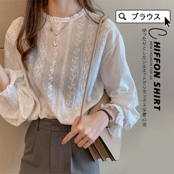 ブラウス レディース トップス 長袖 シャツブラウス クルーネック レース フェミニン オフィス 着痩せ チュール 大人セレブ 韓国 インナートップス
