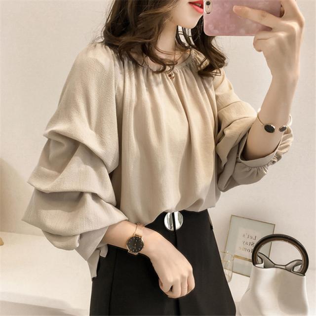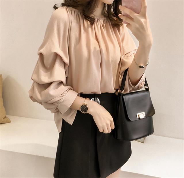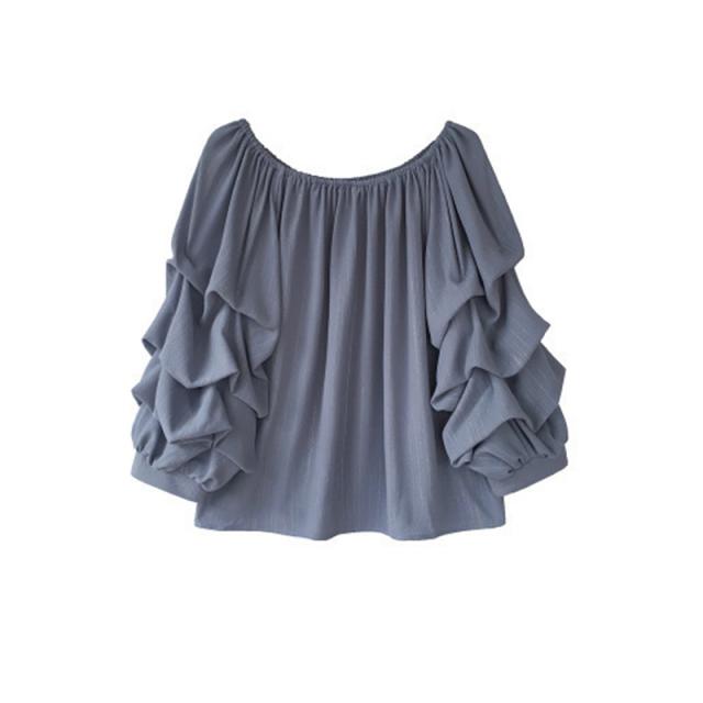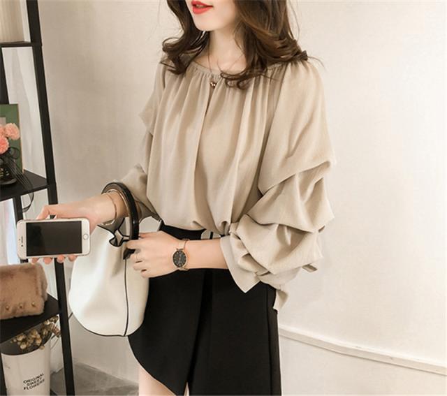 ブラウス レディース トップス 長袖 シャツブラウス クルーネック シフォン ボリューム袖 フェミニン オフィス フリル 滑らか フォーマル 送料無料