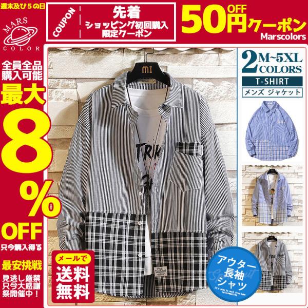 シャツ アウター メンズ ジャケット ワークシャツ 長袖 紳士 ファッション カジュアル 開襟シャツ ソフト シンプル チェック柄 スプライシング