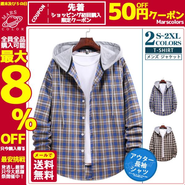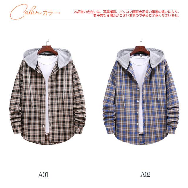 シャツ アウター メンズ ジャケット ワークシャツ 長袖 紳士着 ファッション コート カジュアル 開襟シャツ シンプル フード付き チェック柄 通勤