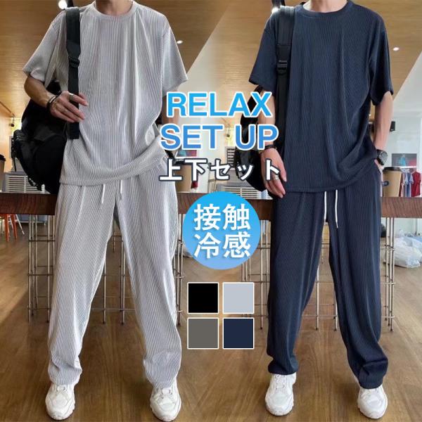 セット メンズ 夏服 半袖 ジャージ 上下セット ロングパンツ サマー 通気 部屋着 接触冷感 涼しい ゆったり トップス Tシャツ 送料無料