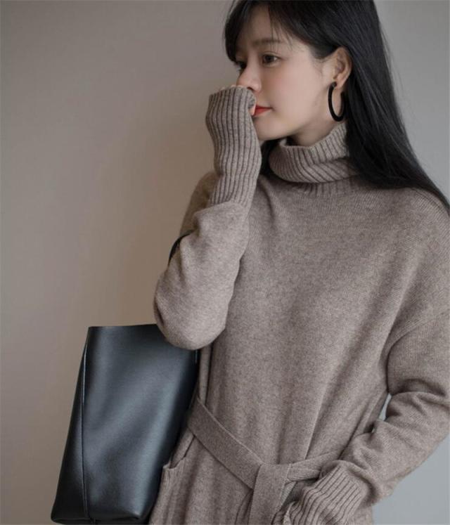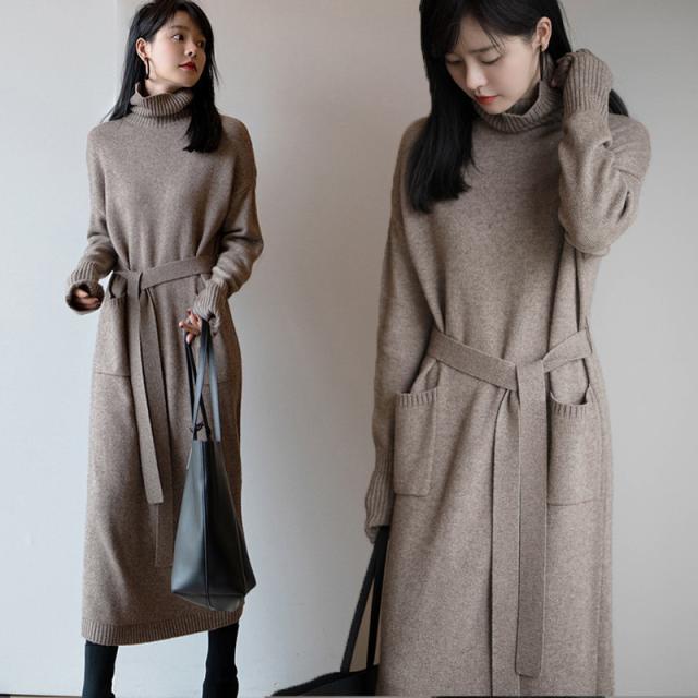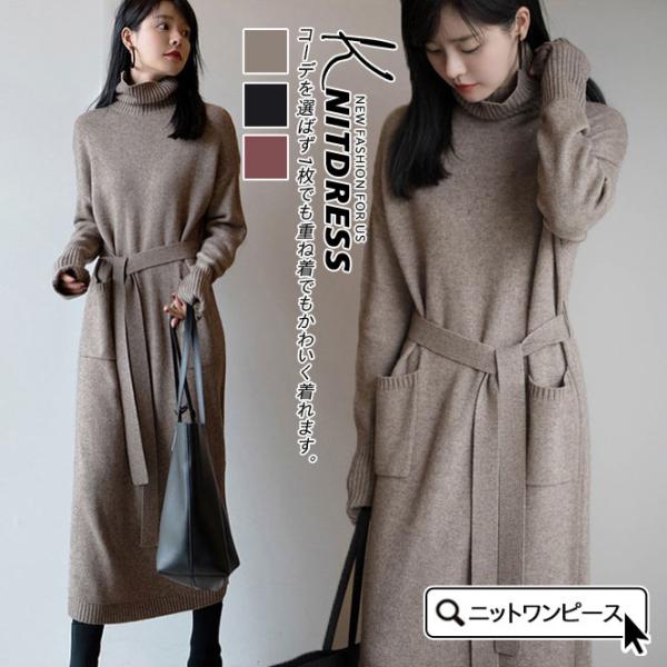 ニットワンピース ニットセーター チュニック フェミニン きれいめ 細見え 暖かい ミモレワンピ 切り替え ハイネック タートルネック 長袖リブニット