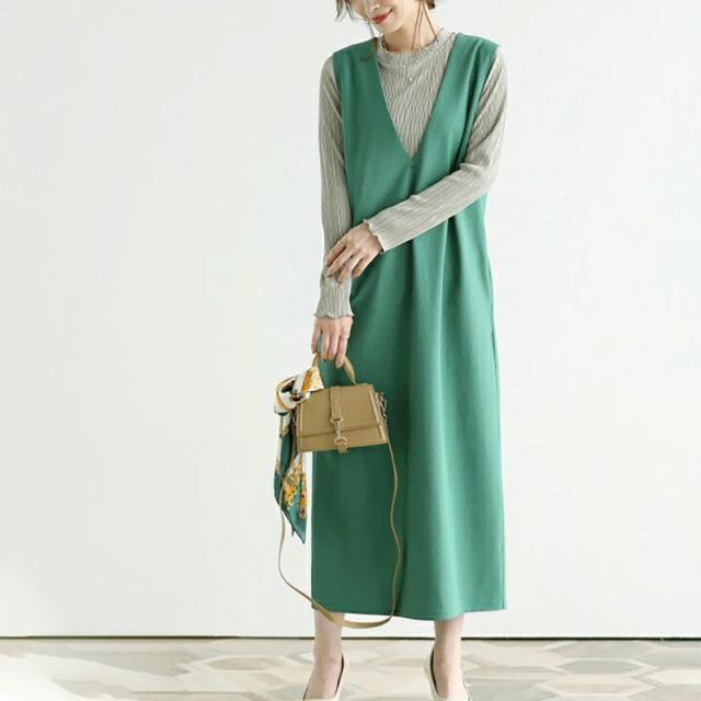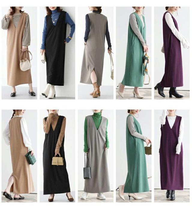 ジャンパースカート ノースリーブワンピース Iライン ジャンスカ vネック マタニティ レディース 春秋冬 体型カバー ストレートシルエット送料無料