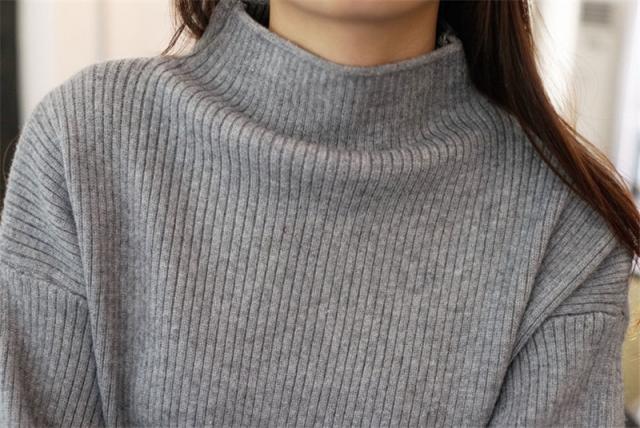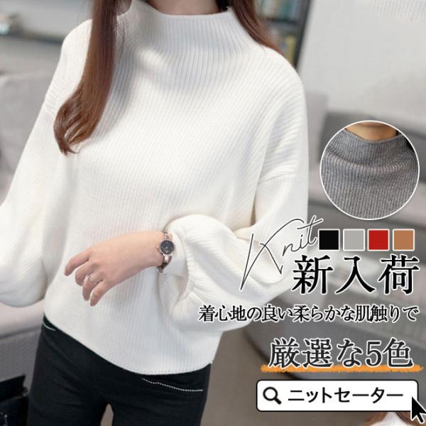 ニットセーター ニットソー レディース トップス プルオーバー リブニット ハイネック ミドル丈 ぽわん袖 大人 オフィス タイト 伸縮 体型カバー