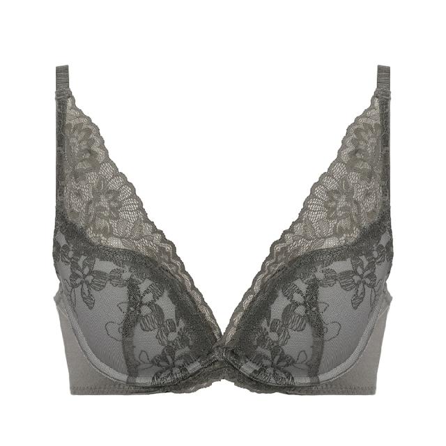 ディープVシルエットは、“前中心が低くカップ脇の高いパターン”と“バストを前中心に集める底厚のモールドカップ”で、きれいな谷間を作ります。