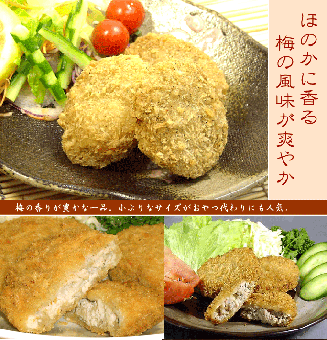| チキンカツのバリエーションとしてどなたにも美味しくお召し上がりいただけるように爽やかな口当たりのチキンカツを追求した結果、梅を選択し、小ぶりで食べやすく、後味すっきりなチキンカツが生まれました。サクと食べればほのかな梅の香り・・女性はもちろんお子様からご年配の方まで喜ばれています。 |