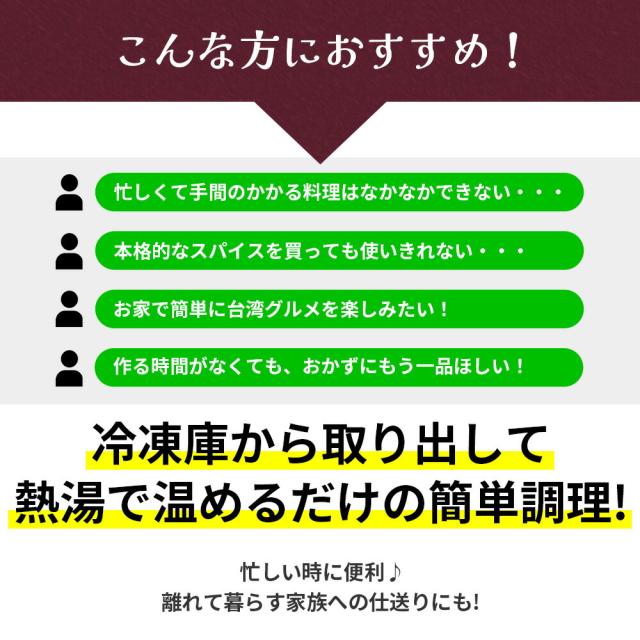 家で作るには少し手間もかかるし、特別なスパイスも買って、結局使い切れない。。なんてこともよくありますが、こちらの商品は簡単温めるだけで台湾気分♪是非お試し下さいませ。