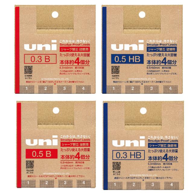 シャープ芯ケース4個分!段ボール素材の詰替用サステナブルパッケージ!空になった本体ケースに、芯を詰め替えて繰り返しお使いいただける「替芯uniUL-SD詰替用」です。