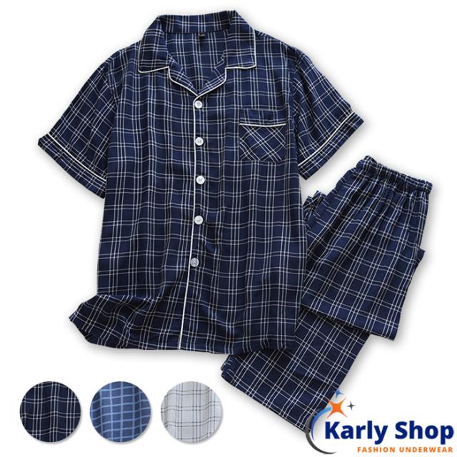 Karly Shop メンズ パジャマ ルームウェア 部屋着 半袖 長ズボン 上下セット 薄手 つるつる 寝巻き 男性用 涼しい 夏 pjm605