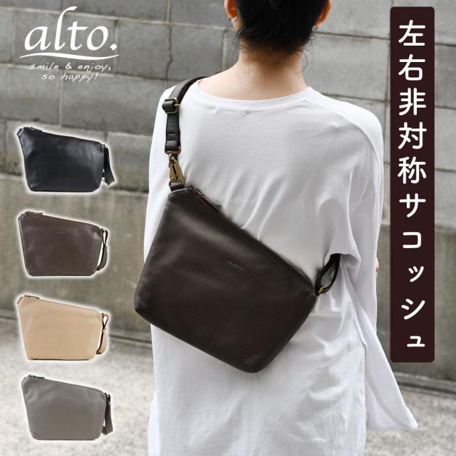 A5サイズ対応変形サコッシュ 左右非対称 タブレット ショルダーバッグ ファスナー開閉 斜め掛け ミニショルダー アシンメトリー 姫路レザー alto アルト 日本製 ウレタンコーティング シュリンクレザー シボ革 レディース メンズ ユニセックス 男女兼用