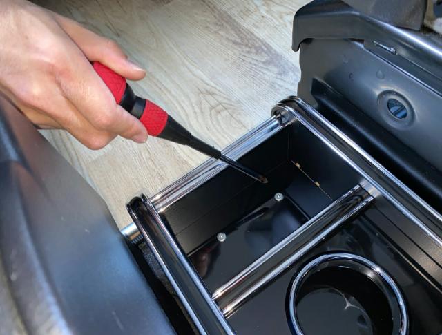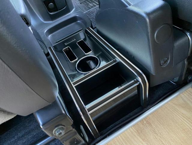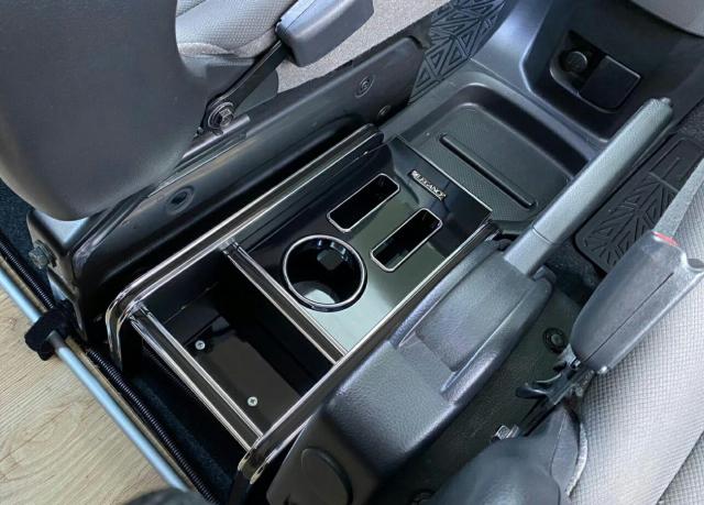 純正センターコンソールのトレイ部分はそのまま使えるようにしており、小物入れも作りました。