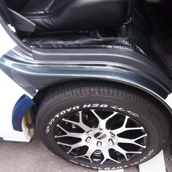 タイヤハウスカバー カーボンルック ブラック ハイエース 200系 1型 2型 3型 4型 (5型) 前期 後期 標準 ナロー ワイド フロントフェンダーカバー 鍵 キズ 保護 キー 平織 綾織 エアロ 外装