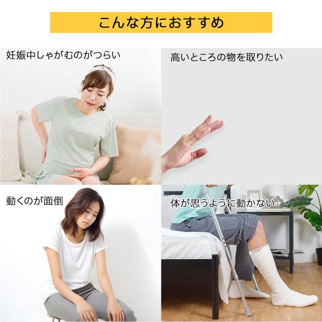 | 【便利性】 | 折り畳み式のデザインで、持ち運びや保管に便利です。 妊婦、高齢者、術後患者、関節炎患者、手根管症候群患者に役立つお助け用ハンドです。 ひざ痛と腰痛で高いところの物を取ったり、狭い所に落ちたものを拾ったりする辛い人にぴったりです。 |