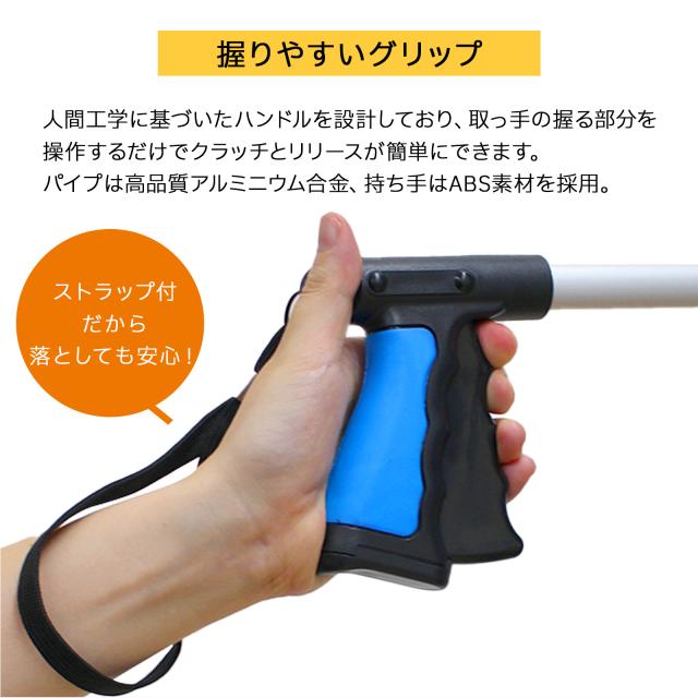 | 【操作簡単】 | 人間工学に基づいたハンドルを設計しており、取っ手の握る部分を操作するだけでクラッチとリリースができ、 高い、低い、遠い、狭い場所にある対象物を素早くつかむことができます。 |