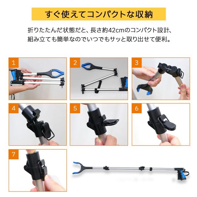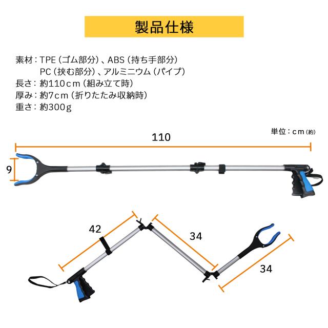 - 足の手術のため購入 折りたためて便利かと思ったけど、少し長かったかもと思いましたが、ベットからものをとるのには、便利かもと思いました。少し重いものは、取るのが難しかったです。