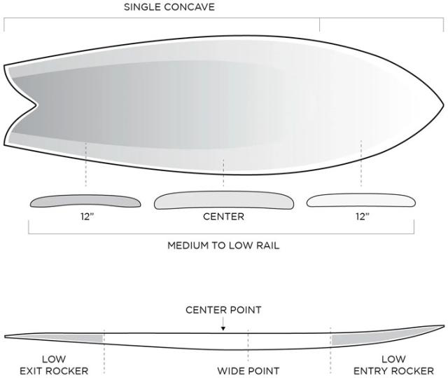 アウトラインは前モデルにも用いられロブ・マチャド本人もその歴史をこよなく愛すサンディエゴ・フィッシュ系。 大きく異なるのは前モデルの特徴でもあったボトムのBoard Eat Board(チャンネルコンケーブ)は、Seasideでの経験と実績も取り入れて深めのシングル to ダブルへアップデートされ、テールの先端にかけてのVeeを継承し組み合わせることで更なるボードの安定性と、よりスムースな水の流れを両立させています。 またテイクオフからターンまでのシームレスなトランジションを実現するために、特別に設計されたロッカーラインによって波に対するレスポンスが一層高まる作りになっています。