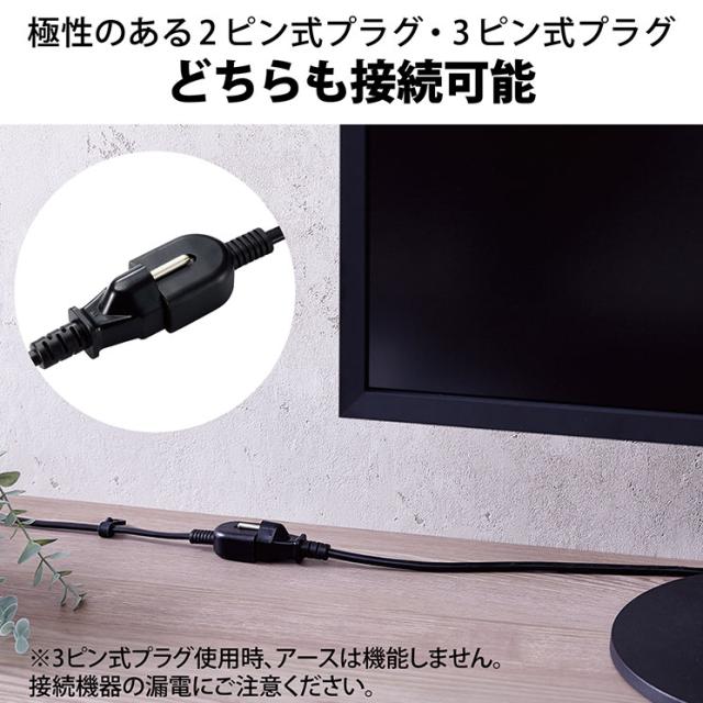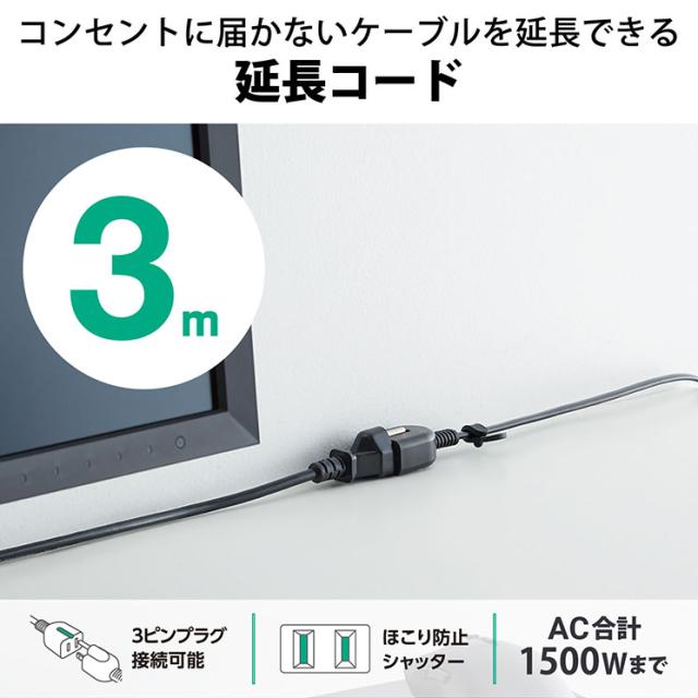 機器のコードがコンセントに届かない場合などに、電源を延長するためのコードです。極性のある2ピン式プラグ・3ピン式プラグでも使用できます。直径10mmの吊り穴を配したシリコン製のタグが付属しており、フックなどに引っ掛けることが可能。トラッキング防止プラグやホコリ防止シャッターで使用時の事故を防ぎ安全に使えます。 ※3ピン式プラグ使用時、アースは機能しません。■差込口仕様:2ピン(極性のある2ピン式プラグと3ピン式プラグも接続可能) ※3ピン式プラグ使用時、アースは機能しません。 ■差込口個数:1個口 ■プラグ仕様:2ピン ■ACコード長:3m ■定格:125V、15A、1500Wまで ■極性対応:△(差込口は対応、プラグは目印のみ) ■スイッチ:× ■雷ガード:× ■ほこりシャッター:○ ■抜け止め機能:× ■差込口キャップ:× ■通電表示ランプ:× ■二重構造:○ ■二重被ふく:○ ■絶縁キャッププラグ:○ ■スイングプラグ:○メーカー:エレコム型番:T-X01-2130BKお取り寄せ商品について:メーカーの欠品または生産終了時は、当店よりご注文をキャンセルさせて頂く場合がございます。予めご了承ください。