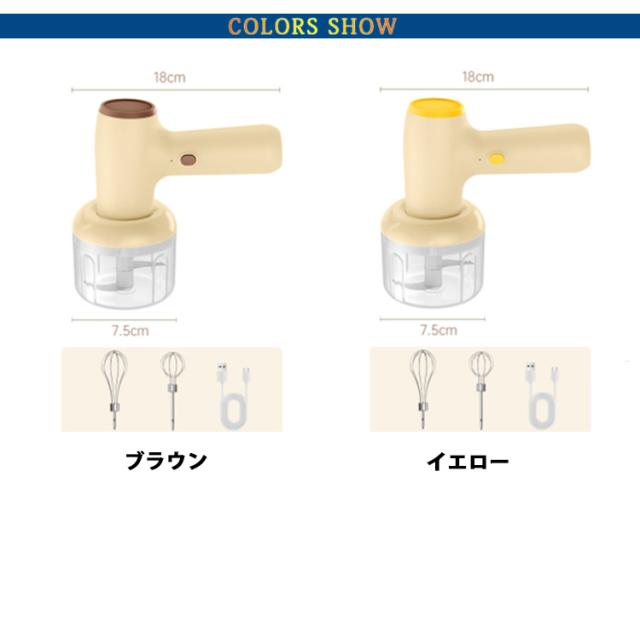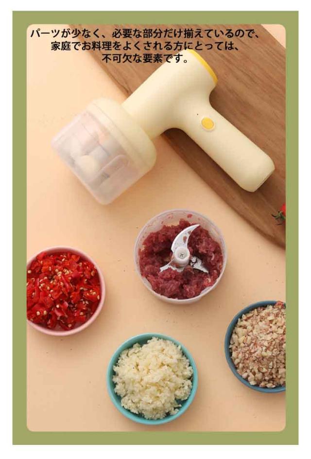 | 1台7役可能なType-C充電式フードプロセッサー。材料を入れて押すだけで使用簡単!【泡立ても◎】 一台多役のフードプロセッサーで、お家で料理の準備がすぐできます。野菜はもちろん、肉・フルーツ・ナッツ類・にんにく・唐辛子・離乳食などの様々な食材を素早く刻み、豊富なお料理に活用できます。 「刻む・混ぜる・練る・潰す・砕く・おろす・泡立て/生クリームの泡立て」をこれ1台で。 本体以外はパーツを分解して丸洗いできるため、衛生面でも安心して使用できます。パーツが少なく、必要な部分だけ揃えているので、家庭でお料理をよくされる方にとっては、不可欠な要素です。それに、本体がコンパクトで、場所を取らず、収納しやすいフードプロセッサーです。 初心者で機械が苦手な方やお年寄りでも、簡単に操作できます。複雑なボタンなどはなく、1つのボタンだけです。 | |