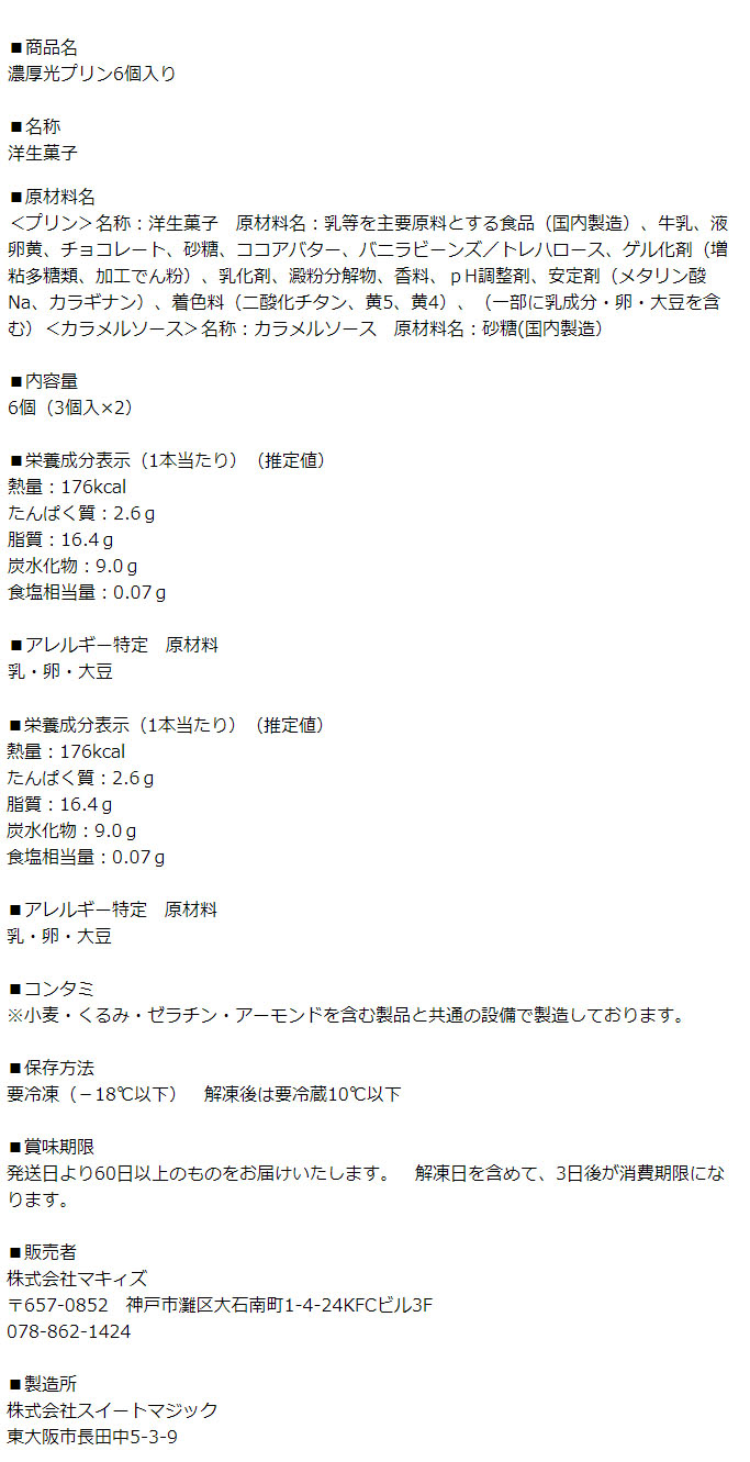 <プリン>名称:洋生菓子 原材料名:乳等を主要原料とする食品(国内製造)、牛乳、液卵黄、チョコレート、砂糖、ココアバター、バニラビーンズ/トレハロース、ゲル化剤(増粘多糖類、加工でん粉)、乳化剤、澱粉分解物、香料、pH調整剤、安定剤(メタリン酸Na、カラギナン)、着色料(二酸化チタン、黄5、黄4)、(一部に乳成分・卵・大豆を含む)<カラメルソース>名称:カラメルソース 原材料名:砂糖(国内製造)