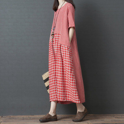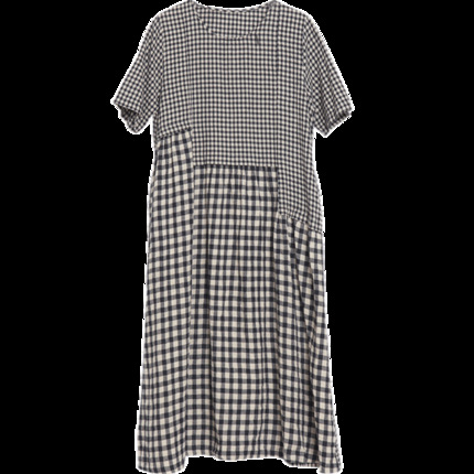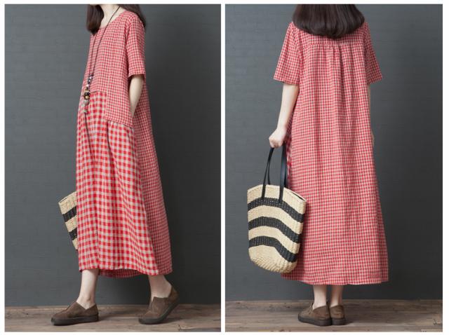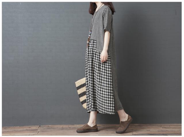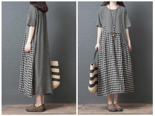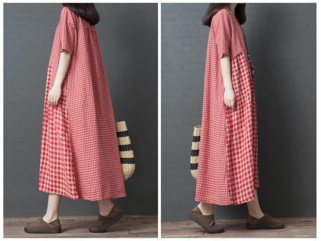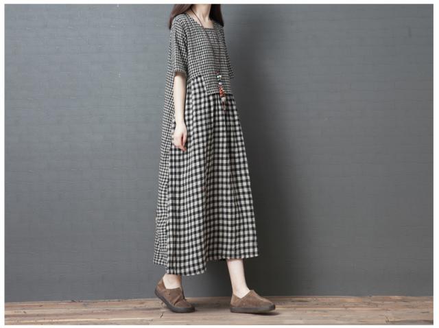 送料無料 ワンピース 綿麻 ワンピ レディース チェック柄 森ガールワンピース マキシ丈 ゆったり 大きいサイズ 半袖 フレア 切り替え