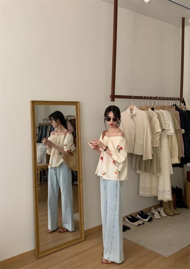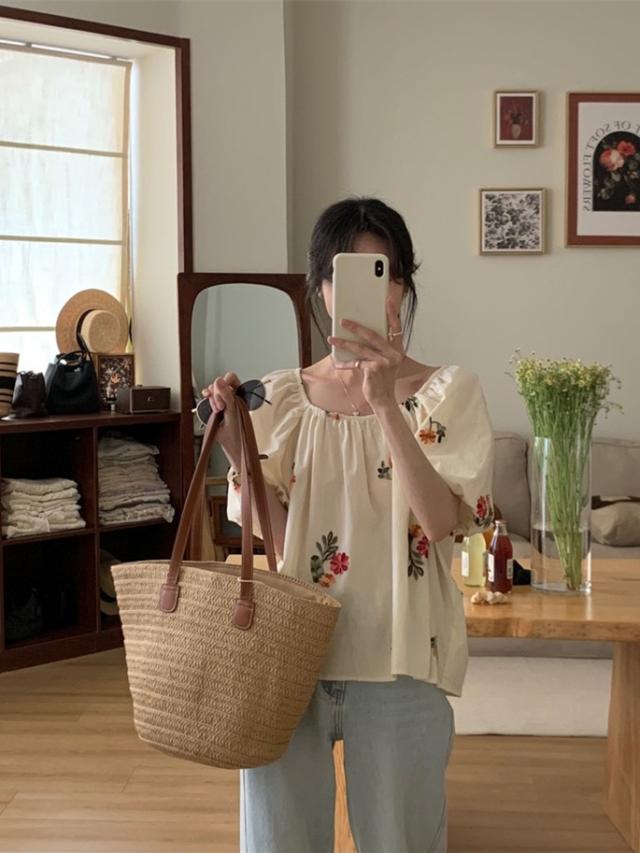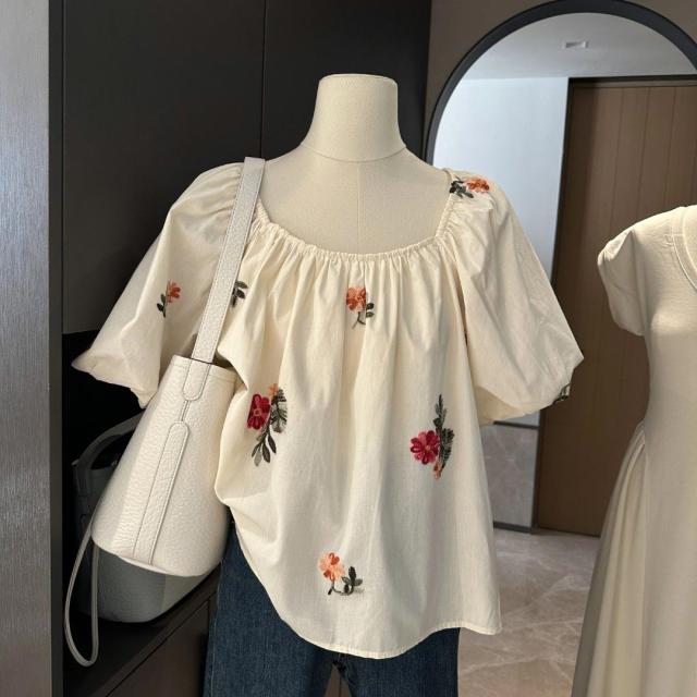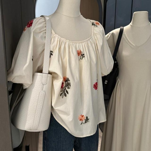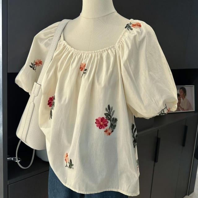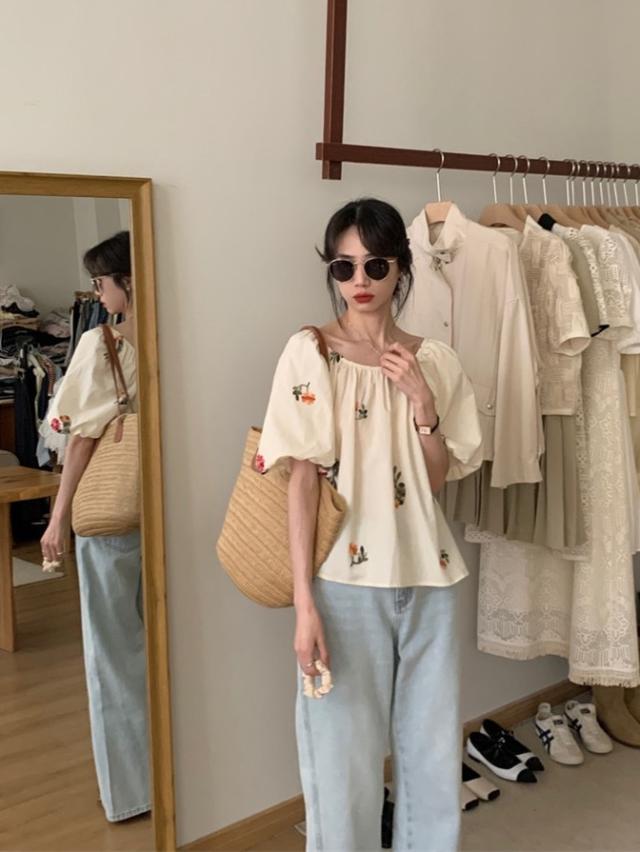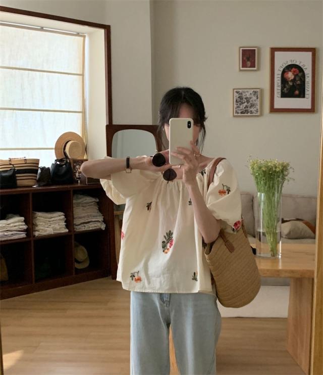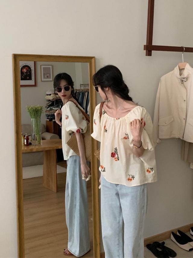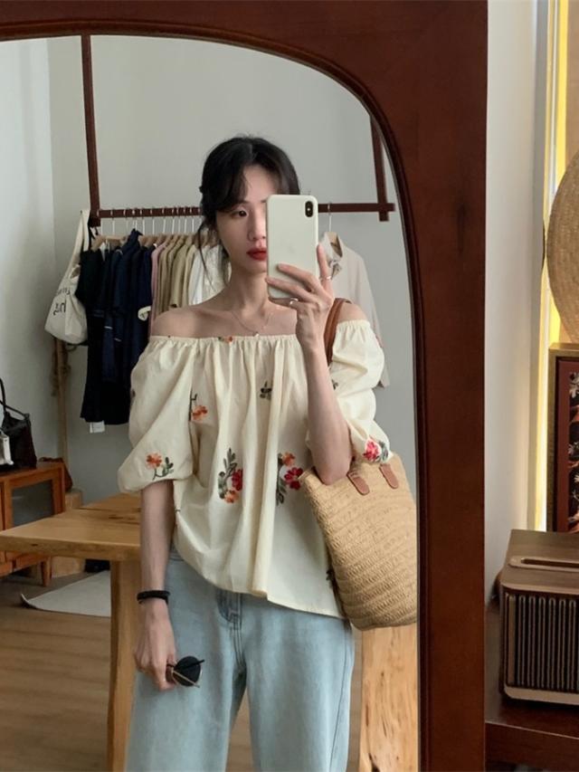 シャツ ブラウス オフショルダートップス レディース トップス 半袖 半袖ブラウス 刺繍 花柄 夏 スクエアネック 肩出し ゆったり カジュアル 韓国ファッション