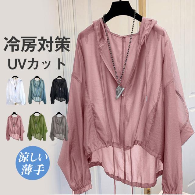 パーカー uvパーカー レディース 長袖 フード トップス 無地 薄手 軽量 透け アウター カーディガン 羽織り 紫外線対策 冷