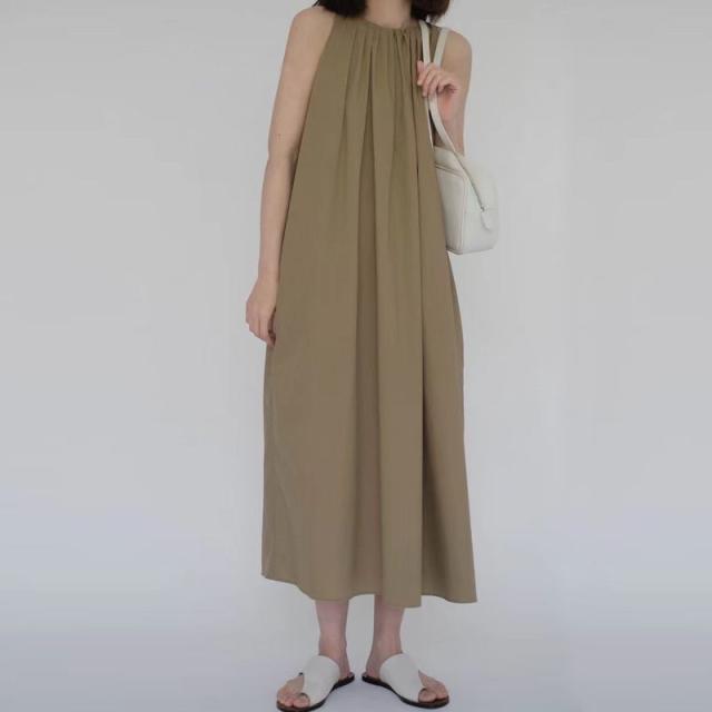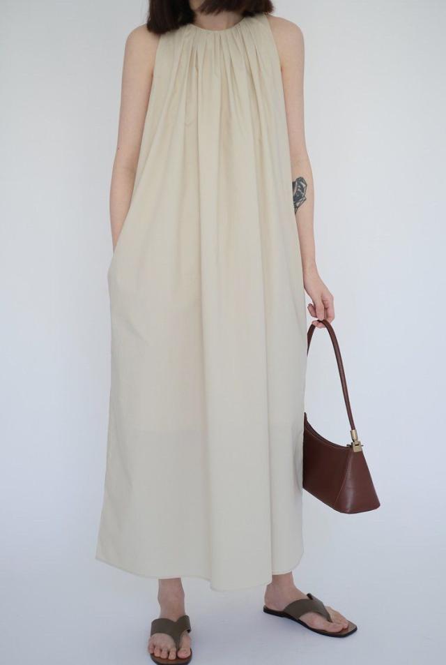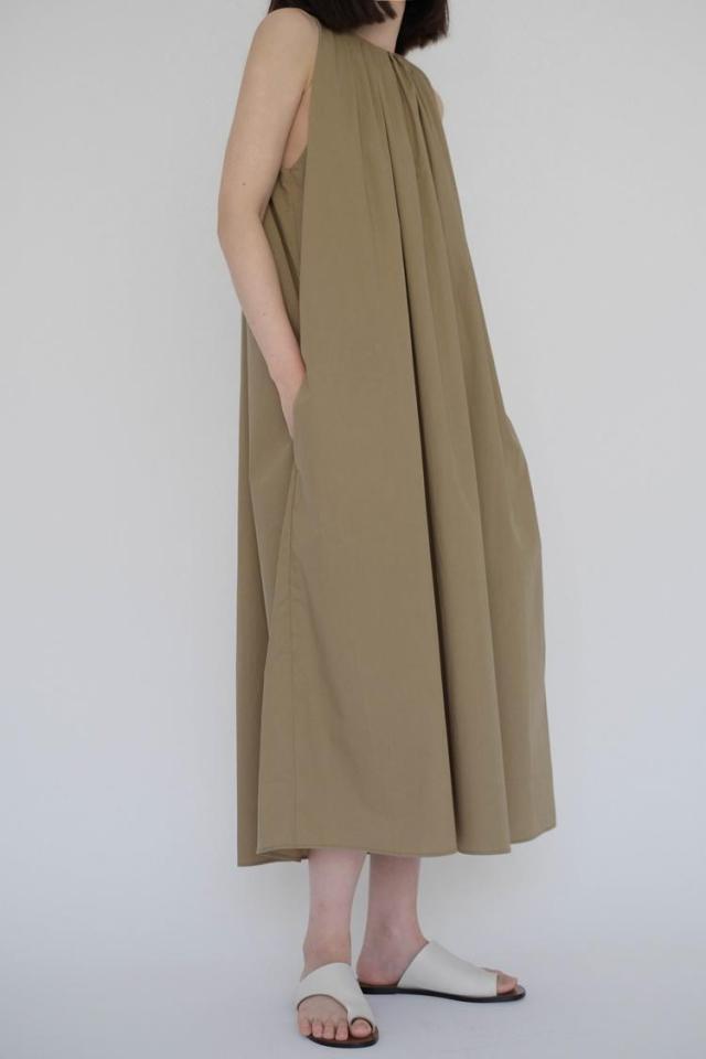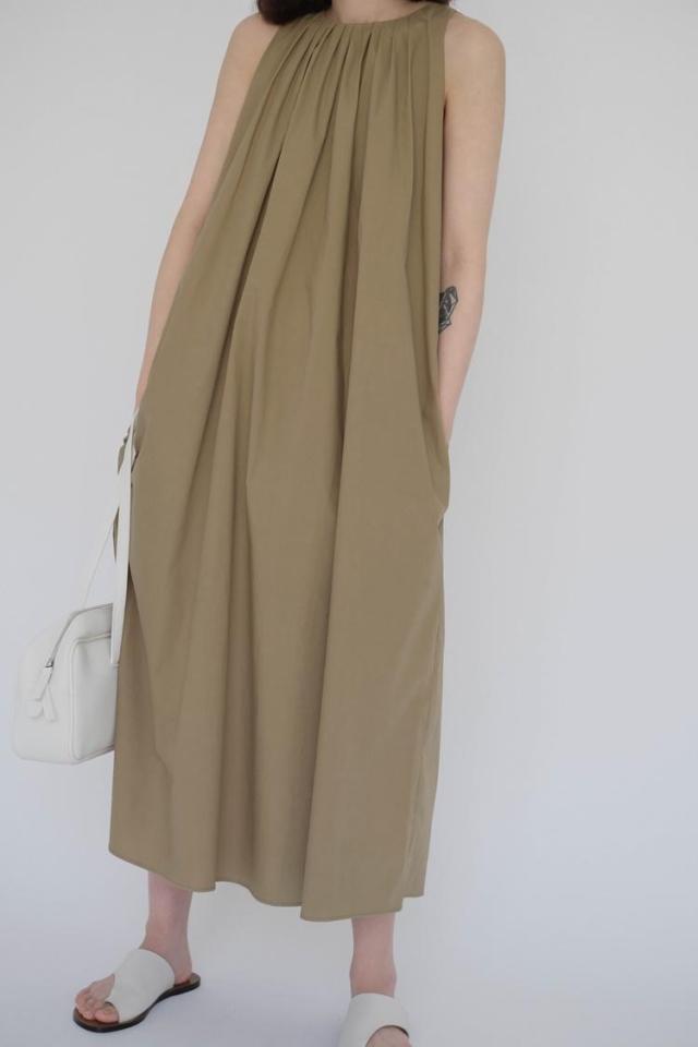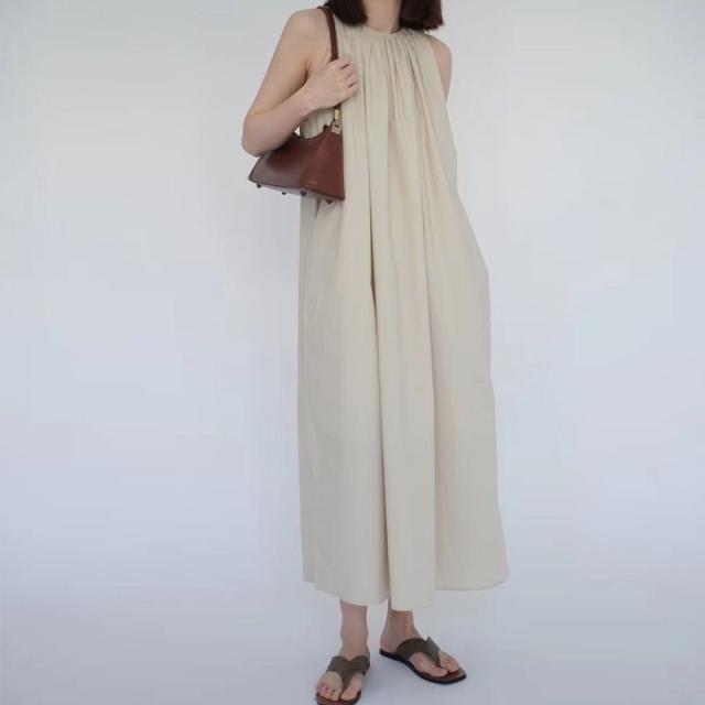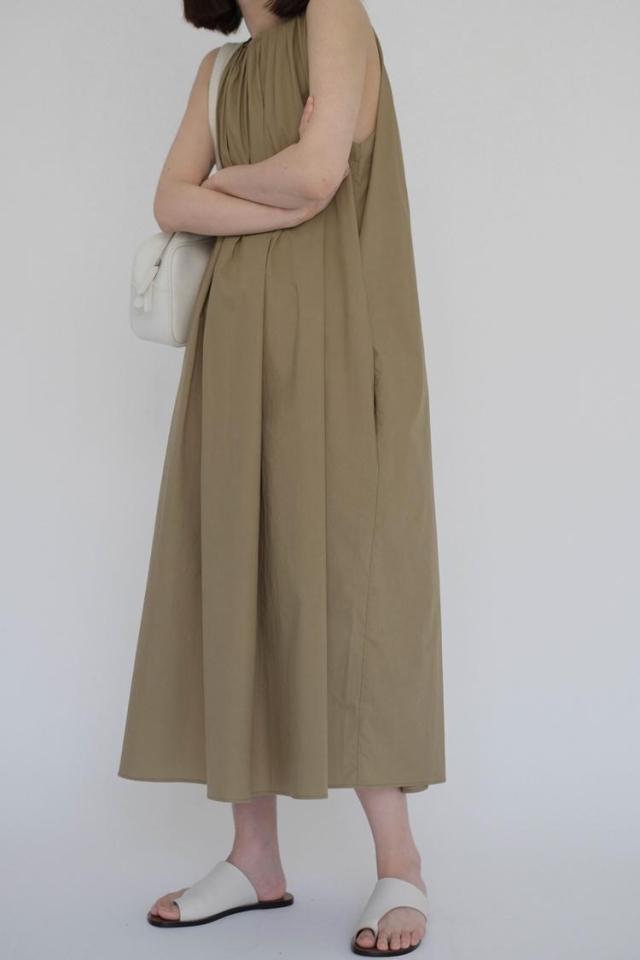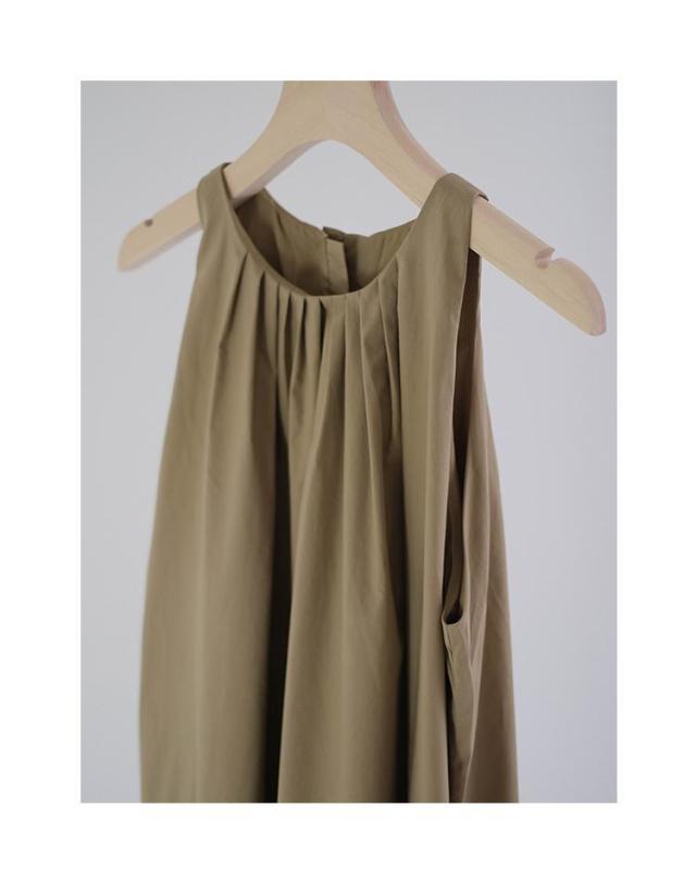 送料無料 ワンピース ギャザー ノースリーブ Aライン フレアワンピース 無地 コットン リネン 綿麻 ロング丈 チュニック マキシ丈 ロングワンピース