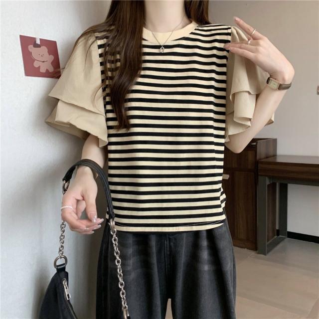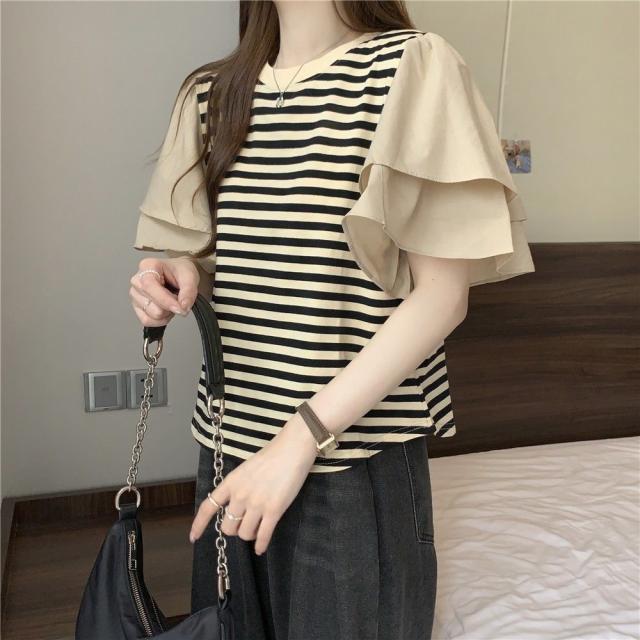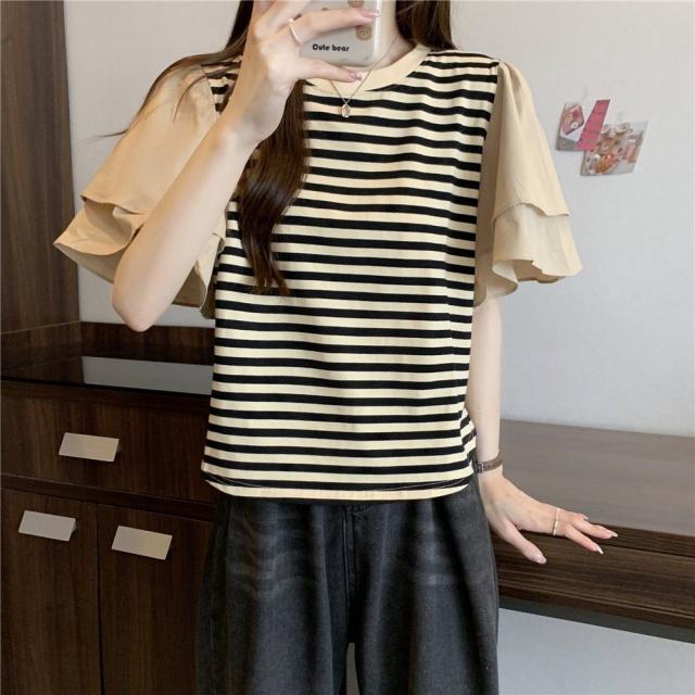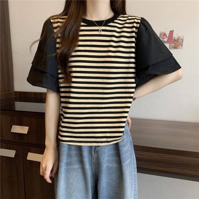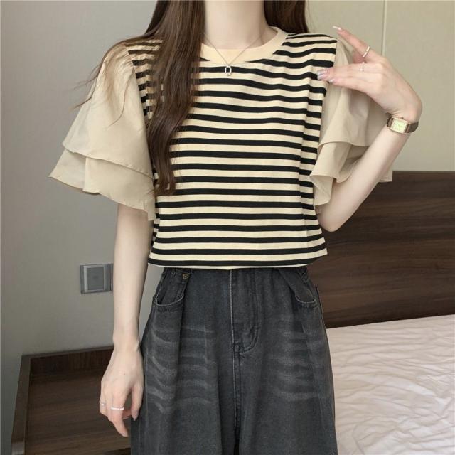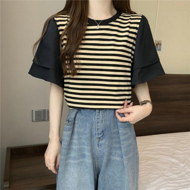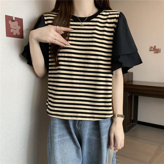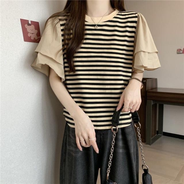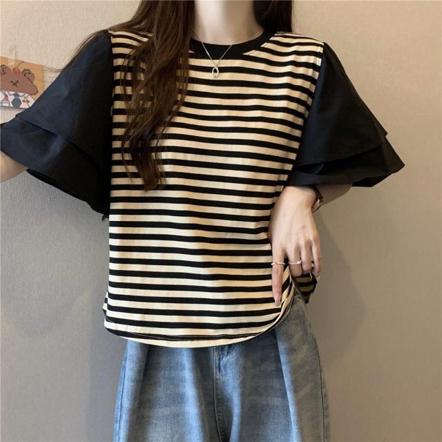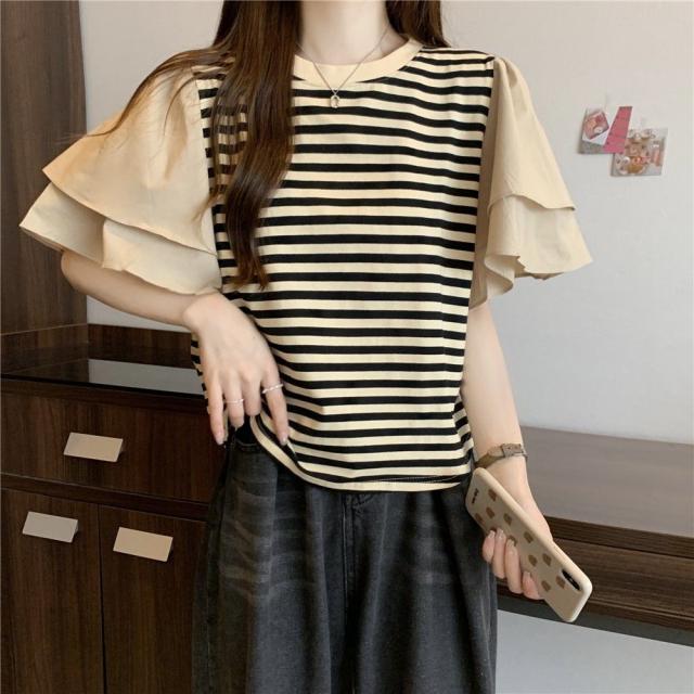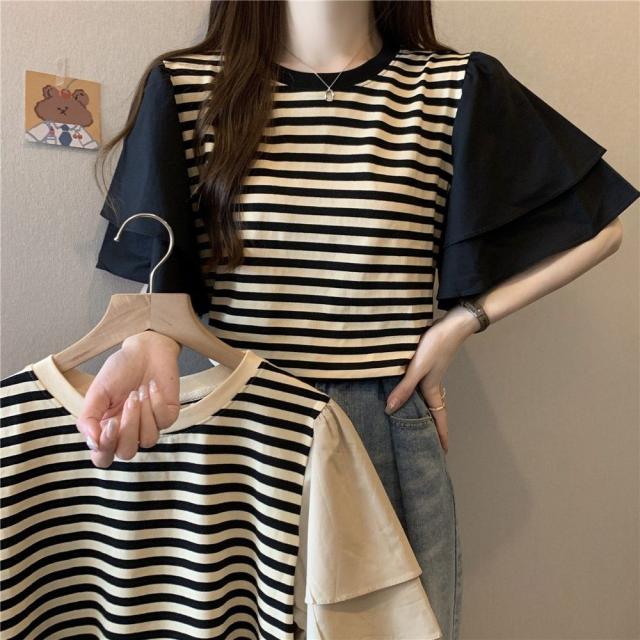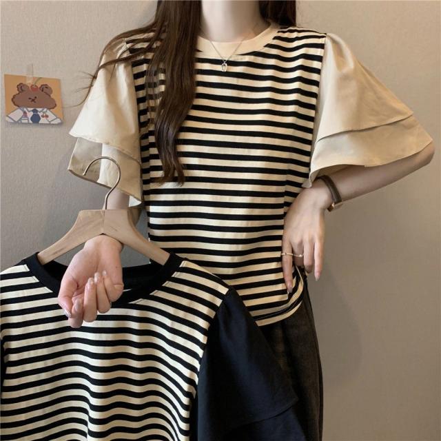 送料無料 ボーダーTシャツ フレア フリル カットソー フェイクレイヤード Tシャツ 半袖 フレアスリーブ 裾シャーリング 落ち感 二の腕カバー ゆったり