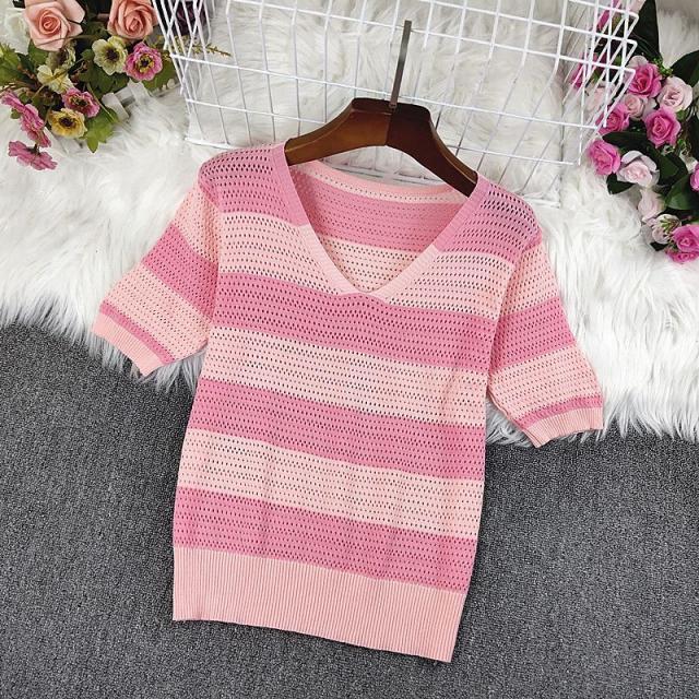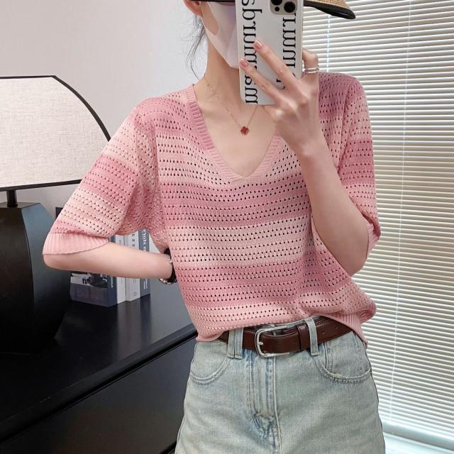 送料無料 透かし編み ニット トップス メッシュ サマーニット ボーダー Vネック レディース 半袖 ボーダー カジュアル サマーニット ゆったり カジュアル