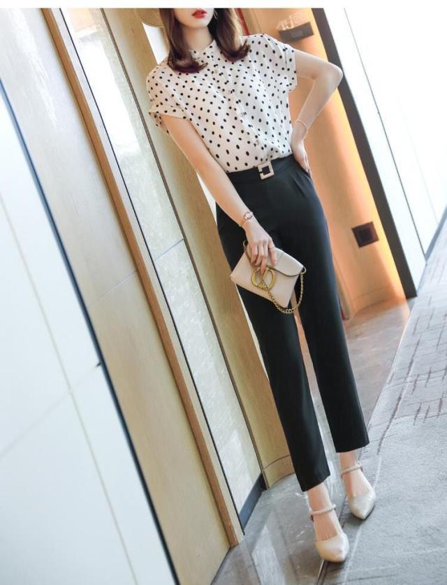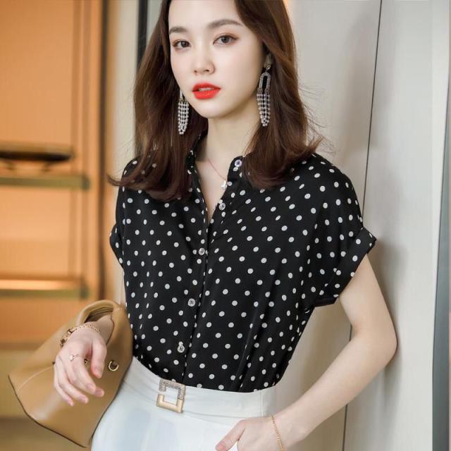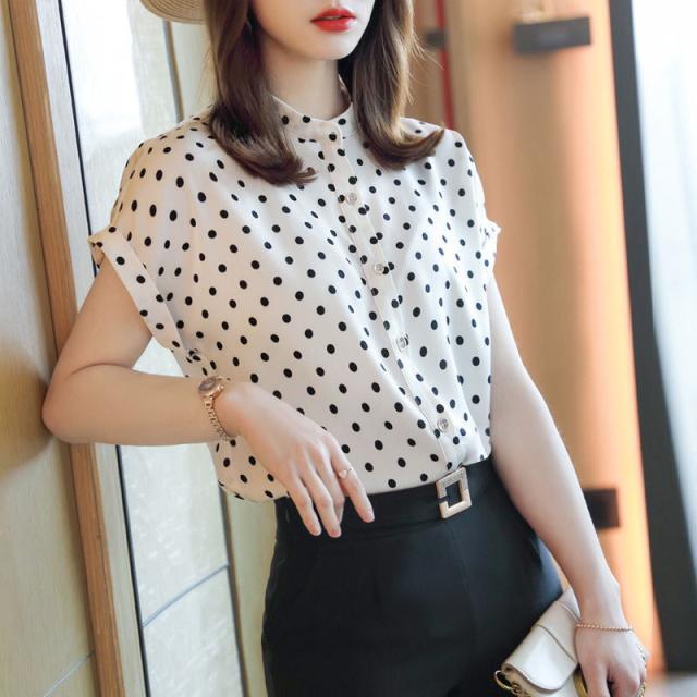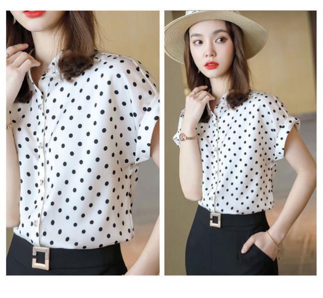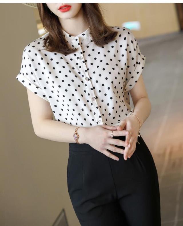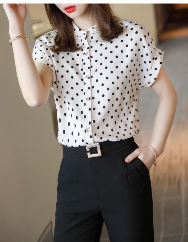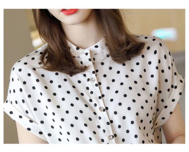 送料無料 ブラウス レディース 夏 シフォン 水玉 クルーネック 半袖 韓国風 白シャツ フォーマル トップス 大人 通勤 きれいめ カジュアル おしゃれ