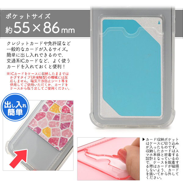 ※カード収納ポケットは、ケースに切り込みが入ったものなので、収納したカードはスマホ本体と密着する設計となっています。ケースを脱着する際はカードが破損しないよう、先にカードを抜いてから外すようにしてください。