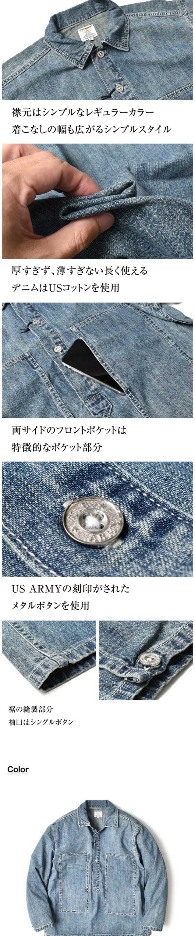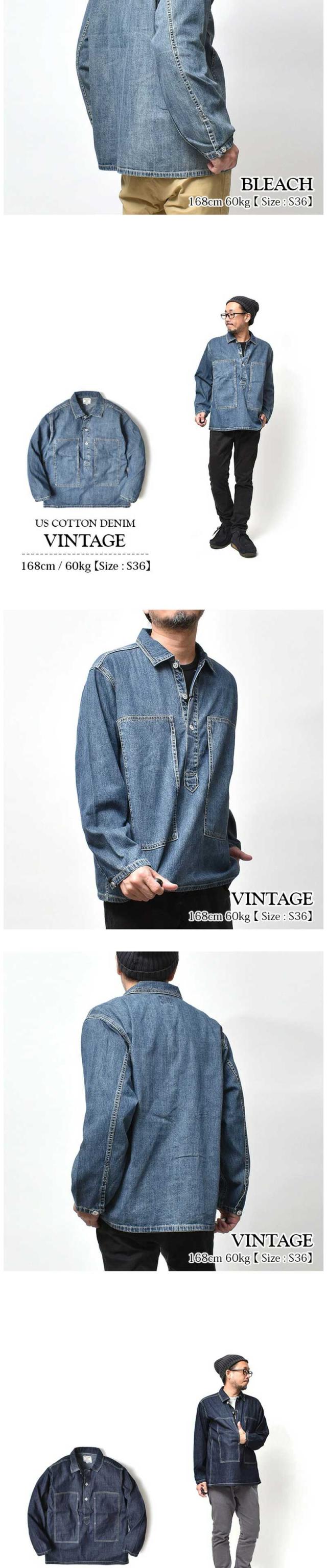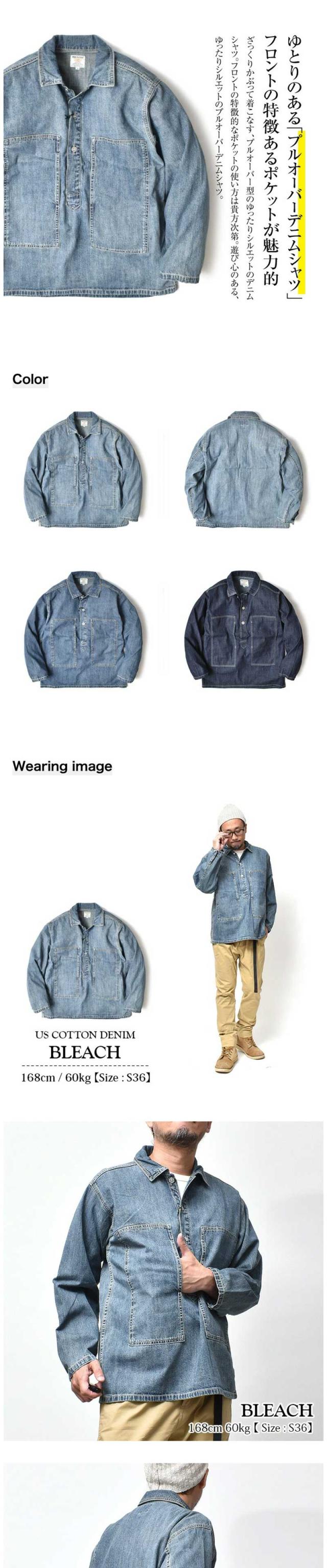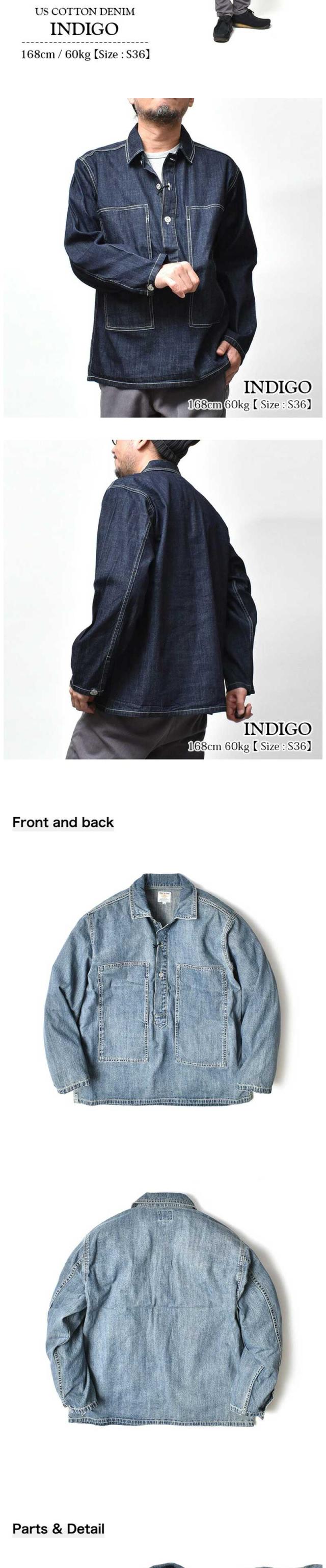 商品詳細:ざっくりかぶって着こなす、プルオーバー型のゆったりシルエットのデニムシャツ。フロントの特徴的なポケットの使い方は貴方次第。遊び心のある、ゆったりシルエットのプルオーバーデニムシャツ。