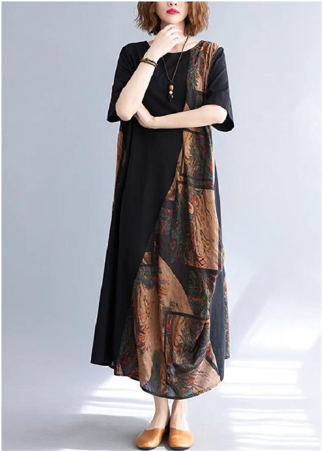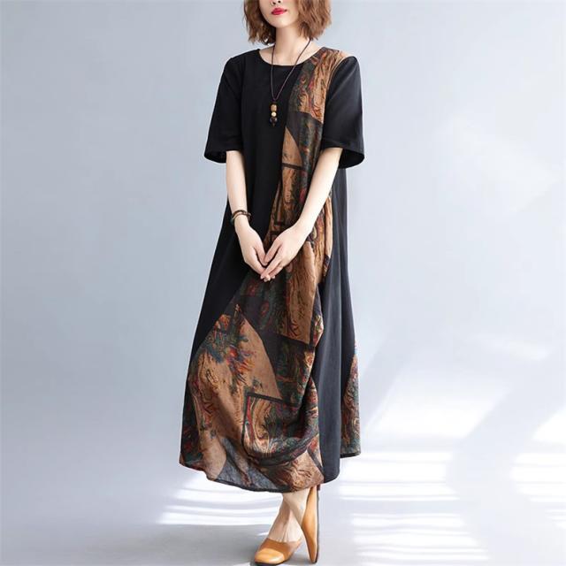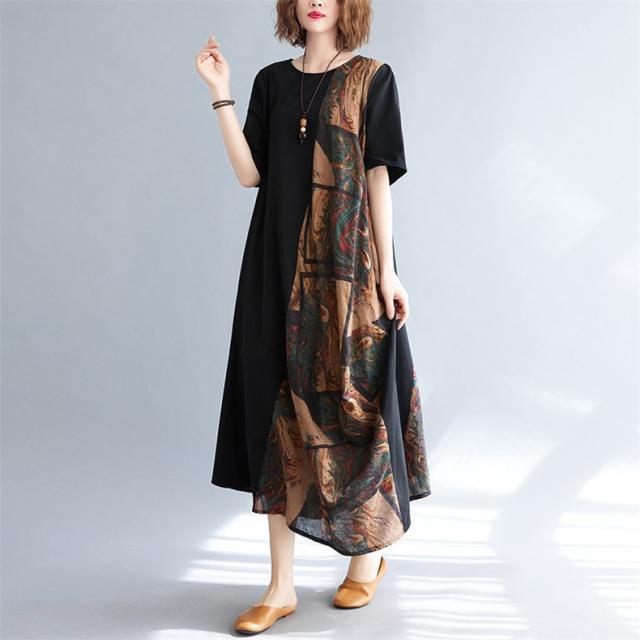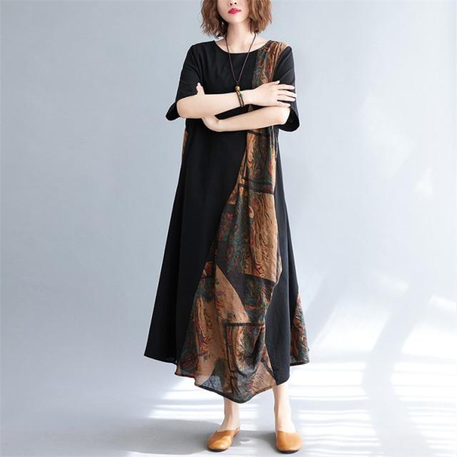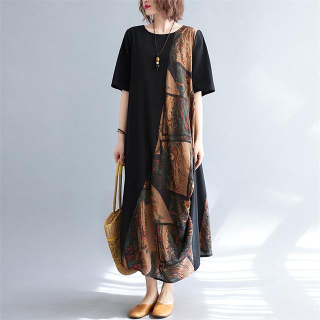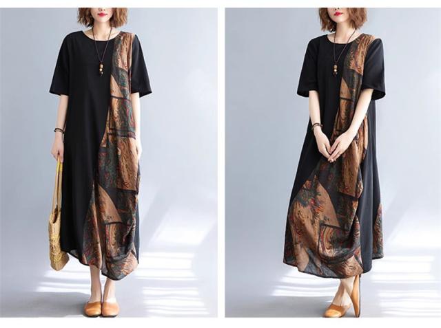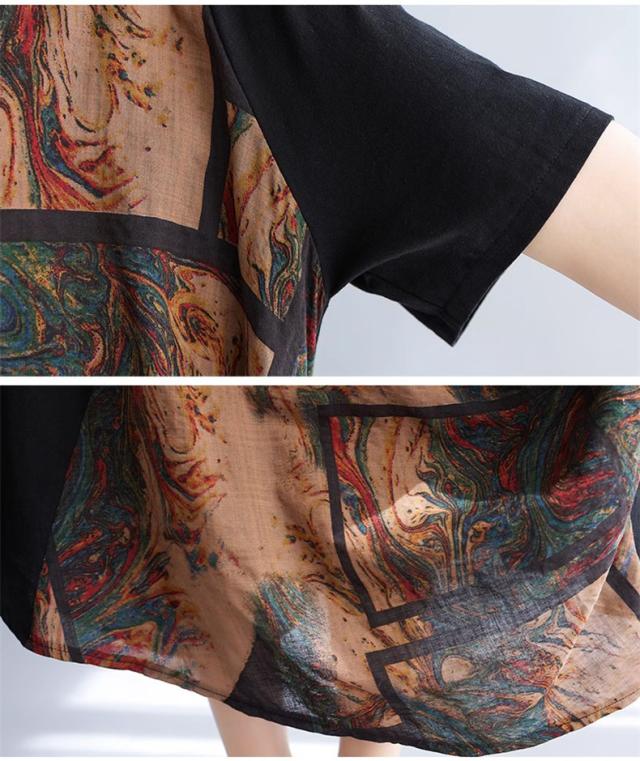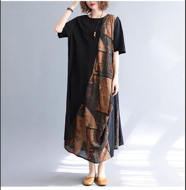 夏ワンピース レディース トップス ロング丈 丸首 薄手 オーバーサイズ マルチ 切り替えワンピース ナチュラルな風合い ボリューム感あり
